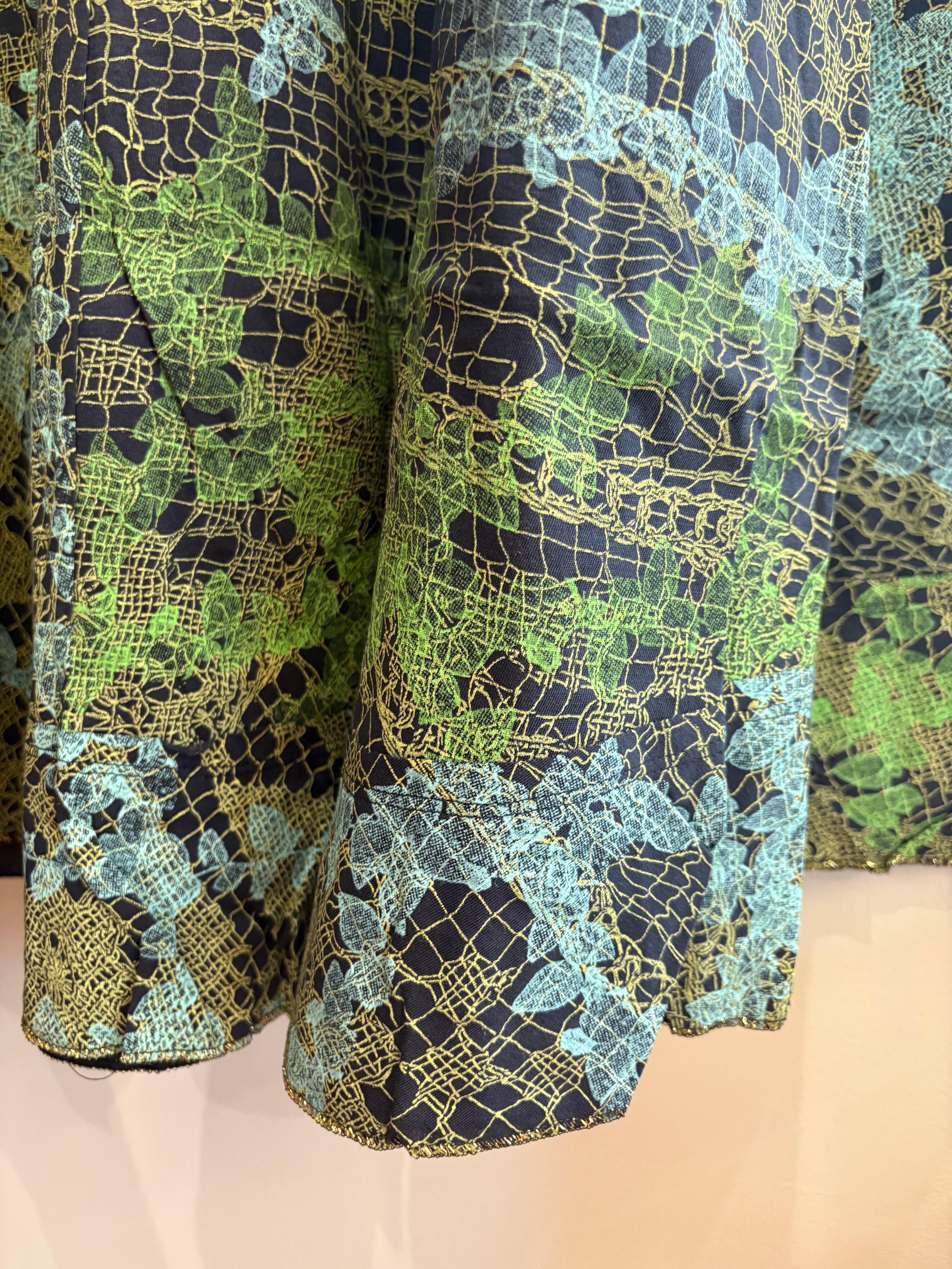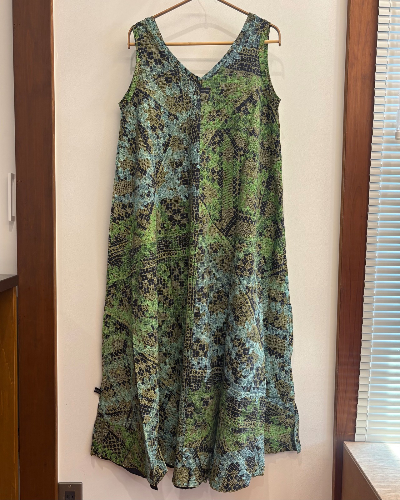 ネックラインはVカットでデコルテをすっきりと見せ、リラックスしながらも女性らしさを演出。ポケットのないシンプルなデザインだからこそ、柄の美しさが際立ちます。