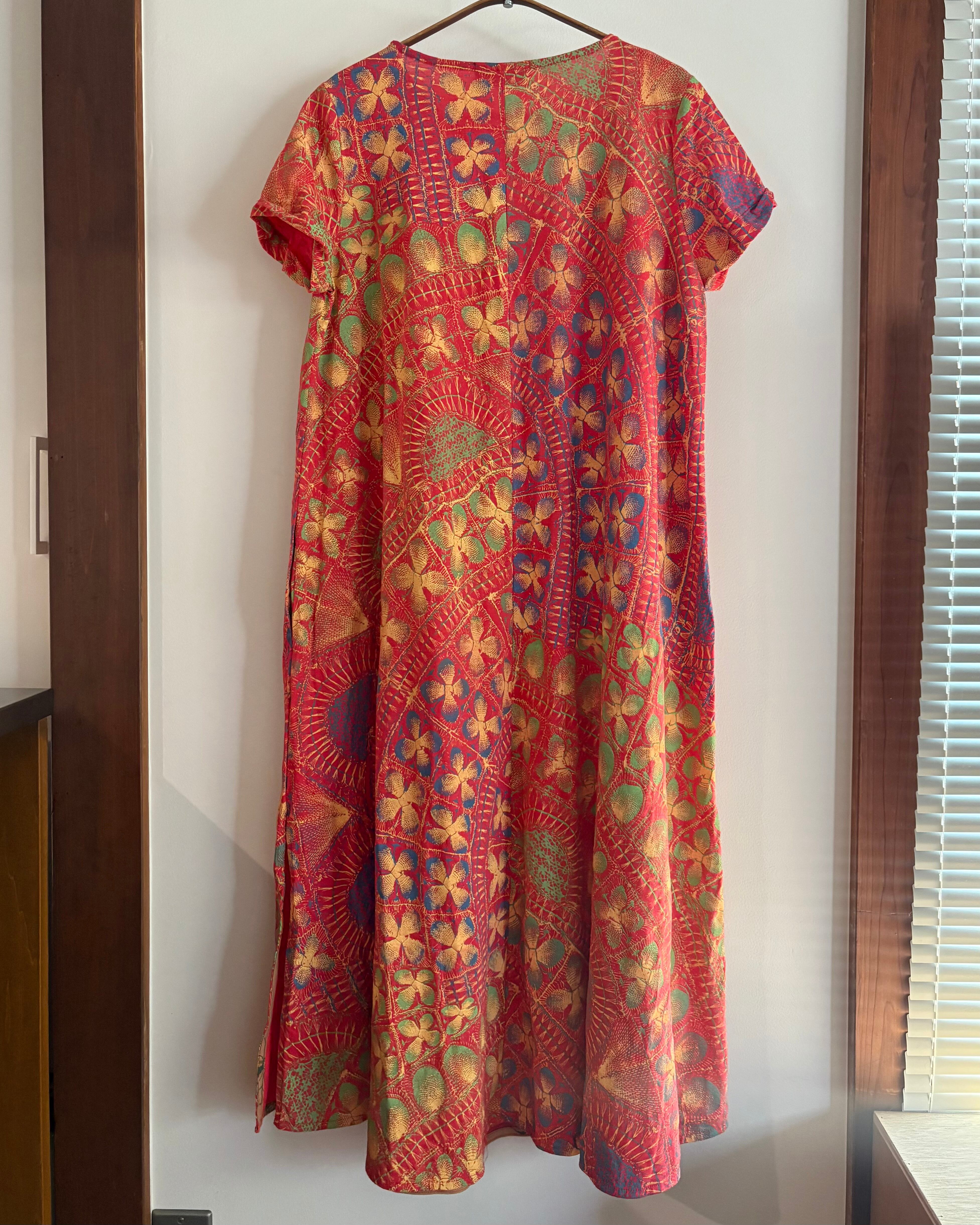 Pima cotton 半袖ワンピース (レッド/ニャンドゥティ柄)