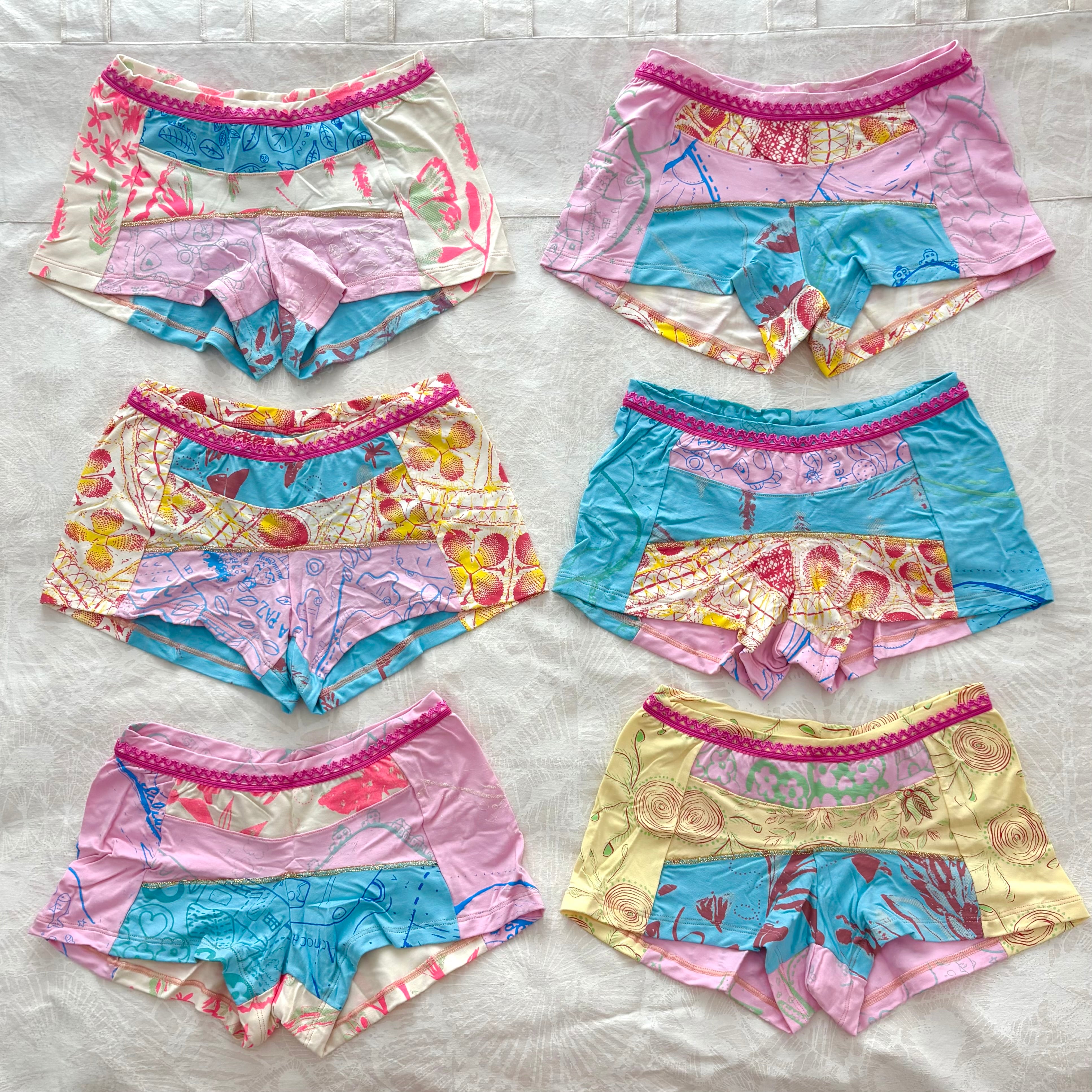 パッチワークのショーツがボクサー型になりました。 お部屋着やインナーパンツに使用されるかたもいるくらい すっぽりとおしりを包み込みショートパンツのようなデザインです。