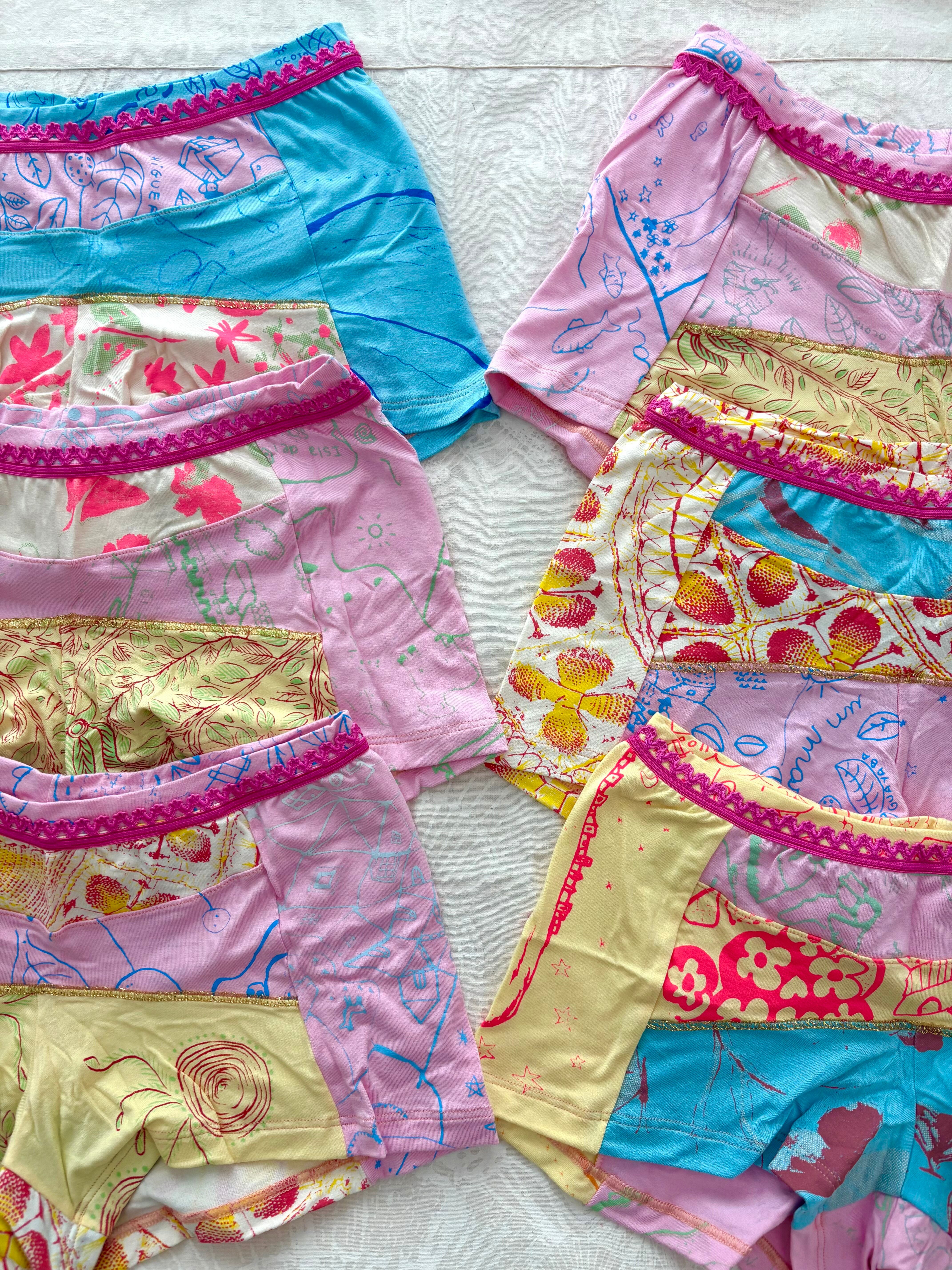 パッチワークのショーツがボクサー型になりました。 お部屋着やインナーパンツに使用されるかたもいるくらい すっぽりとおしりを包み込みショートパンツのようなデザインです。