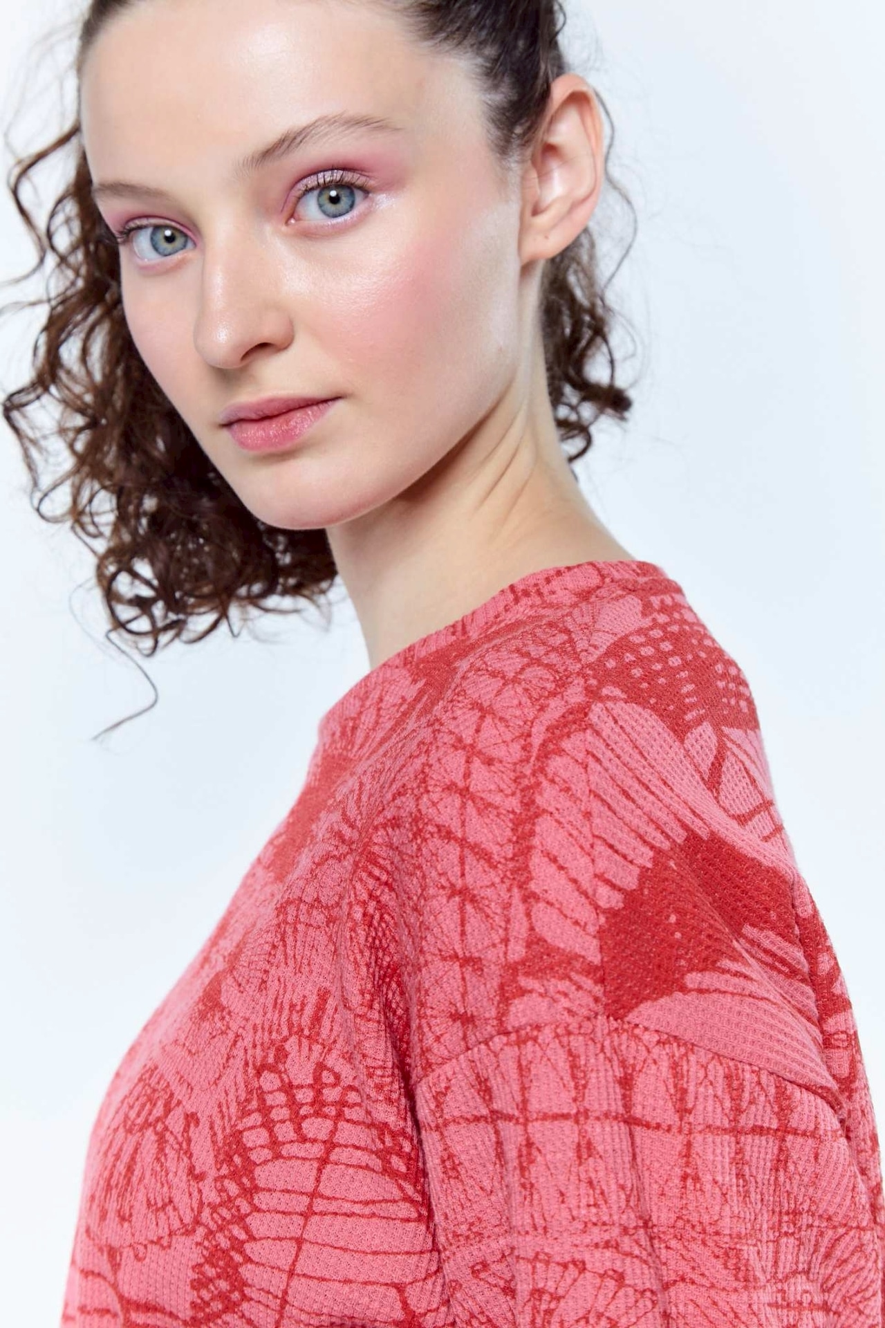衿ぐりのあきは広すぎず、お尻まで隠れるゆったりとした丈感の長袖トップス。ラグランの袖つけや袖口、裾の切り替えデザインもポイントです。