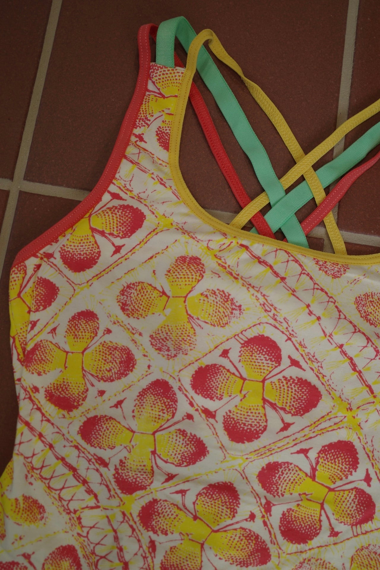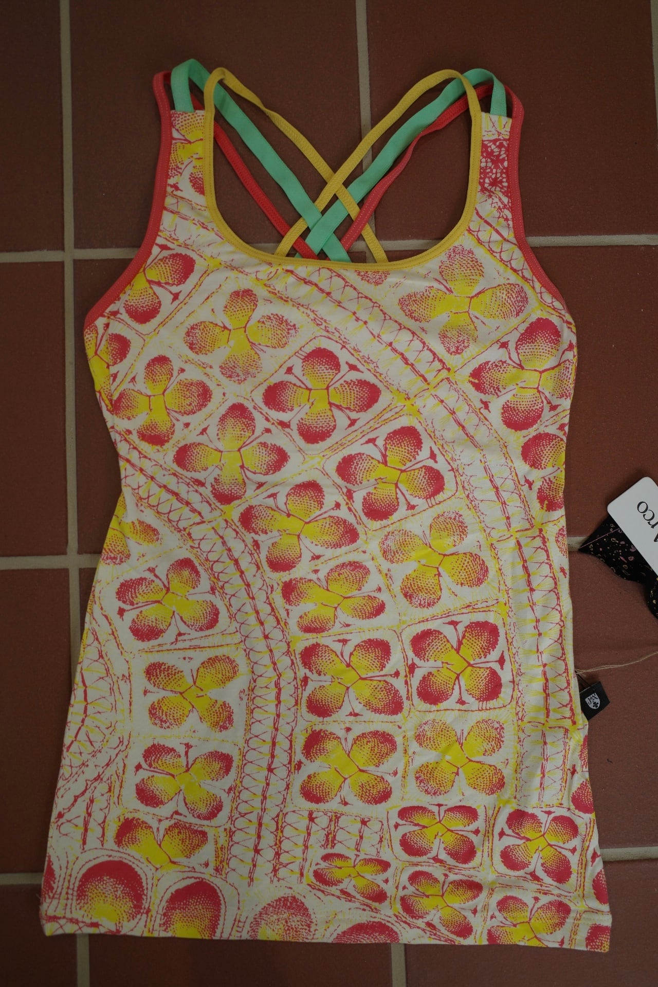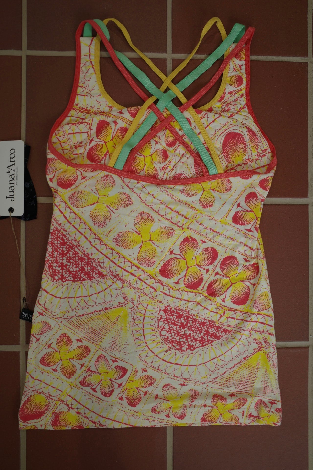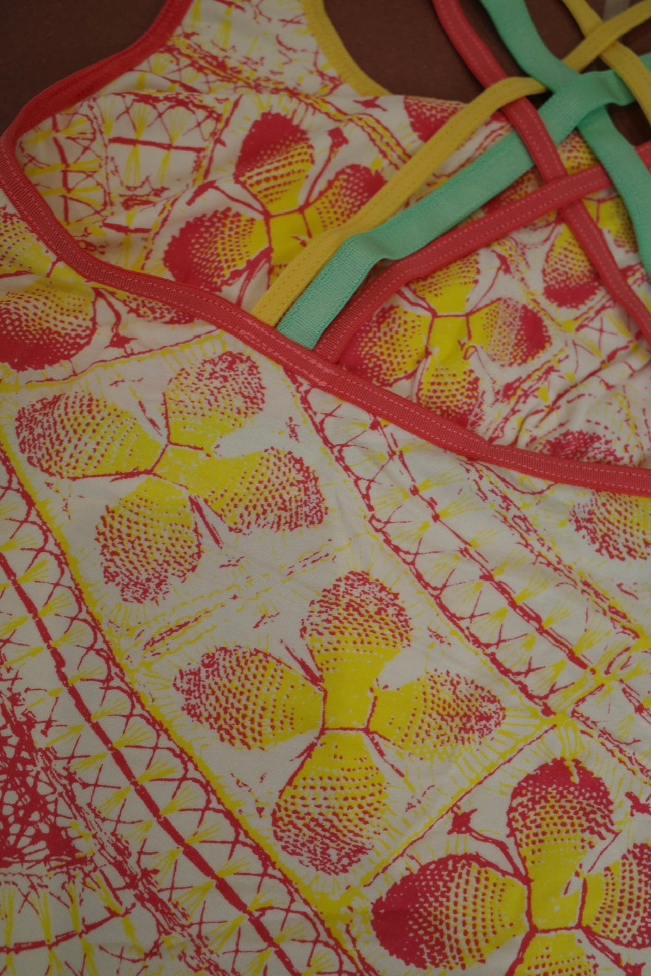 胸元はパッドポケット付きで一枚でインナーに。カラフルな3本ストラップが背中で交差するデザイン。