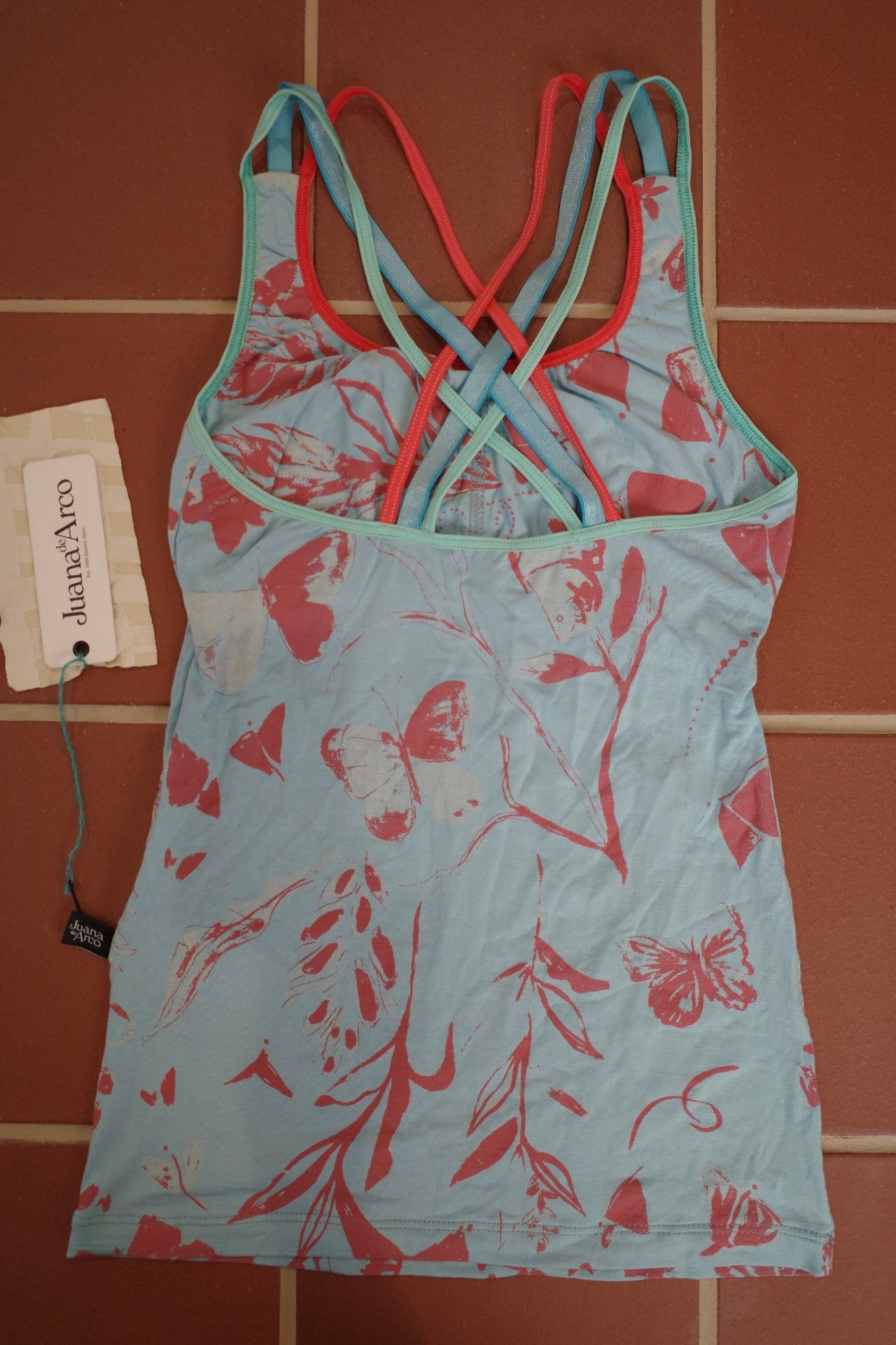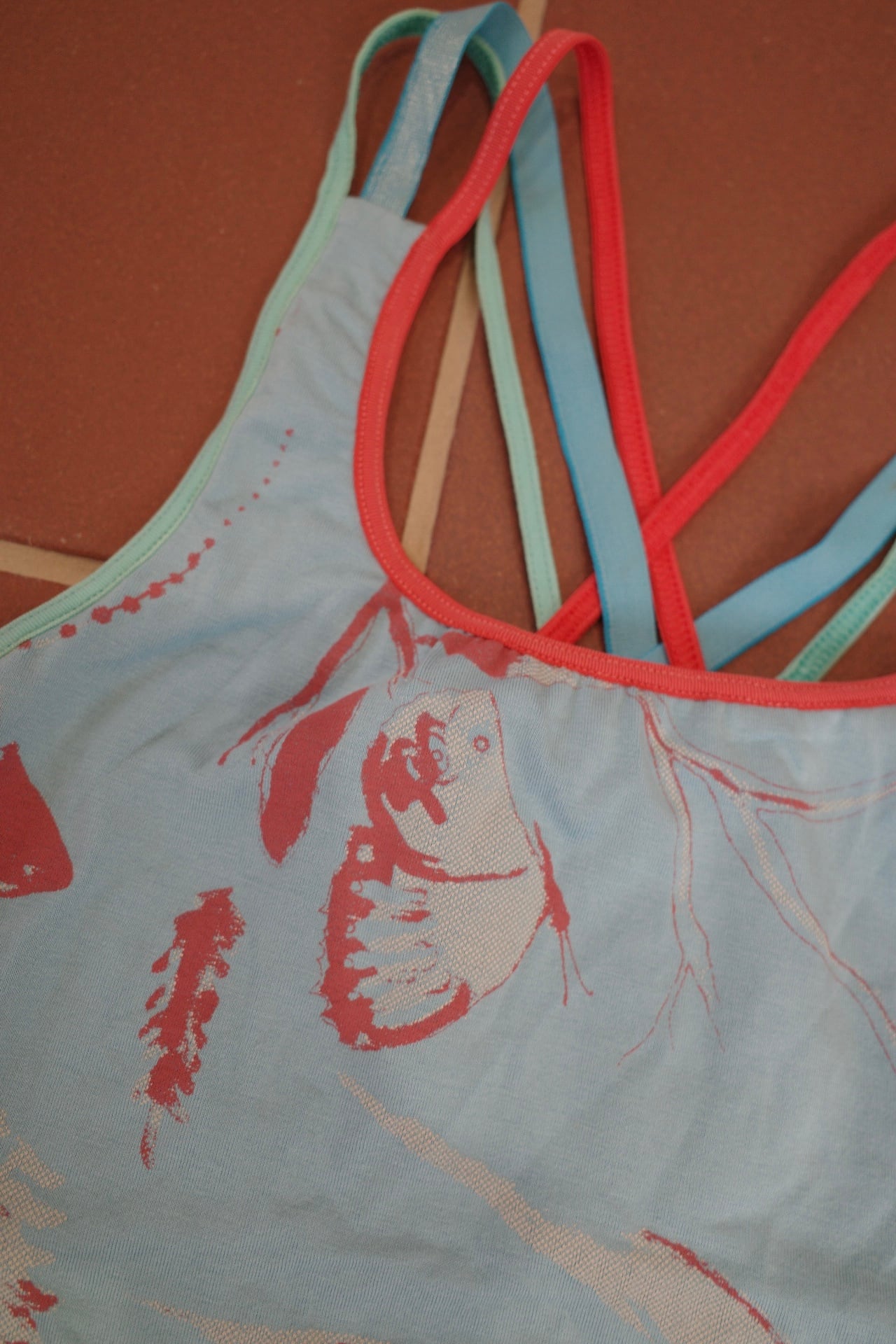 胸元はパッドポケット付きで一枚でインナーに。カラフルな3本ストラップが背中で交差するデザイン。