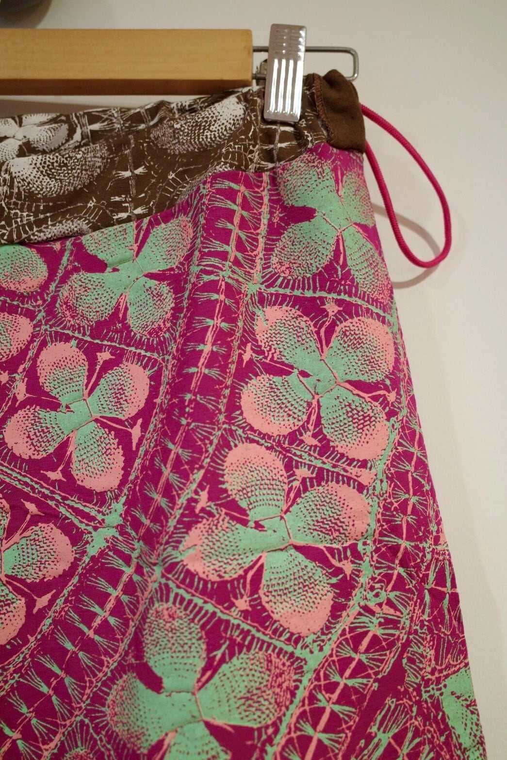 ウエストの生地の切り替えもポイントです。ウエスト部にカラフルなゴムが入っており、左腰できゅっとゴムを絞ってウエストの調節ができます。