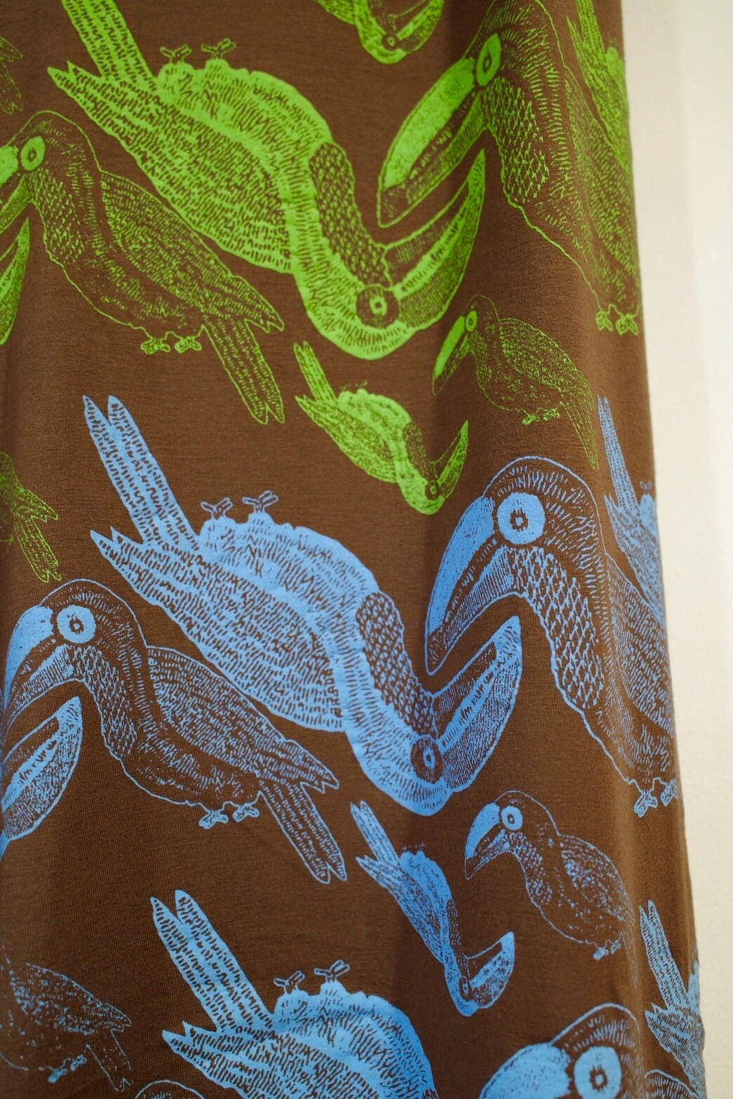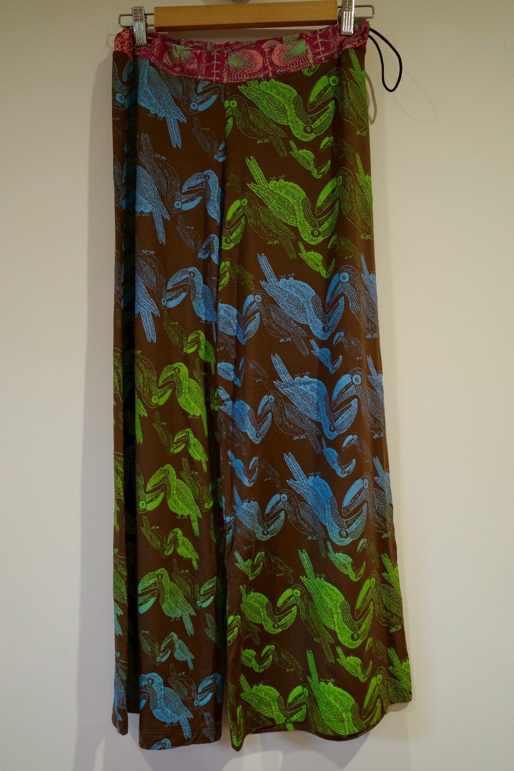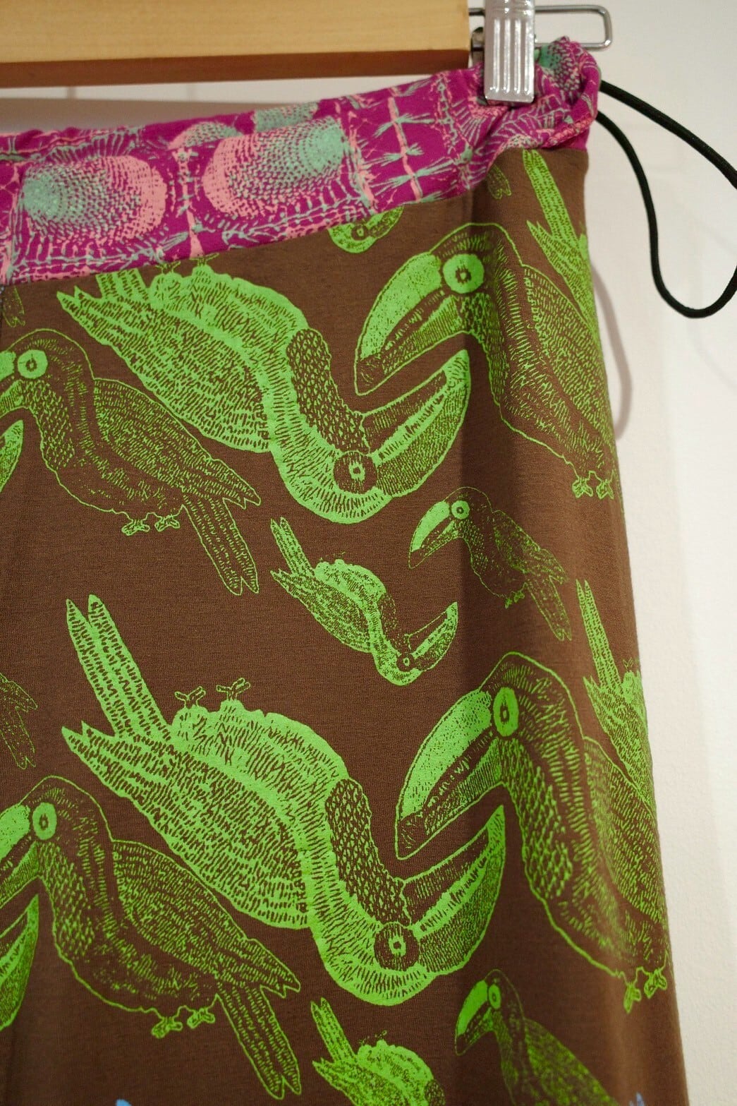 ウエストの生地の切り替えもポイントです。ウエスト部にカラフルなゴムが入っており、左腰できゅっとゴムを絞ってウエストの調節ができます。
