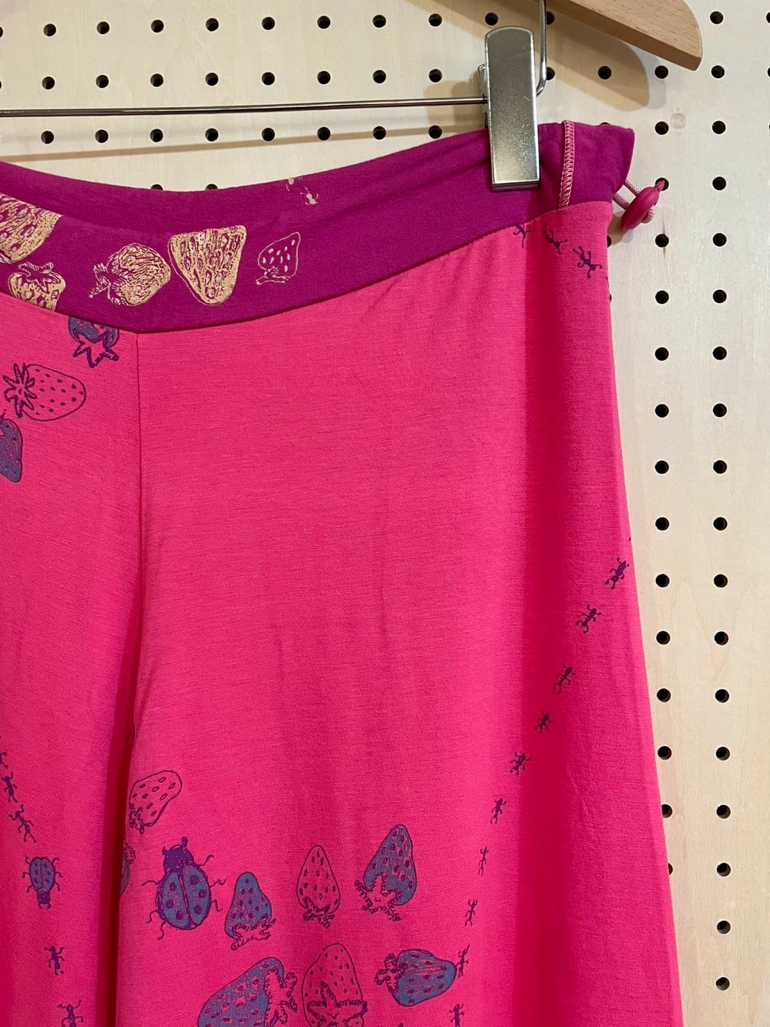 ウエストの生地の切り替えもポイントです。ウエスト部にカラフルなゴムが入っており、左腰できゅっとゴムを絞ってウエストの調節ができます。