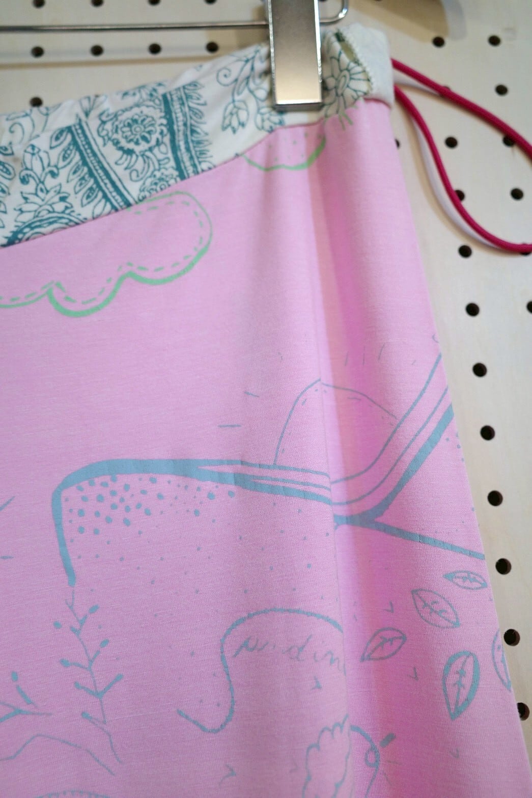 ウエストの生地の切り替えもポイントです。ウエスト部にカラフルなゴムが入っており、左腰できゅっとゴムを絞ってウエストの調節ができます。