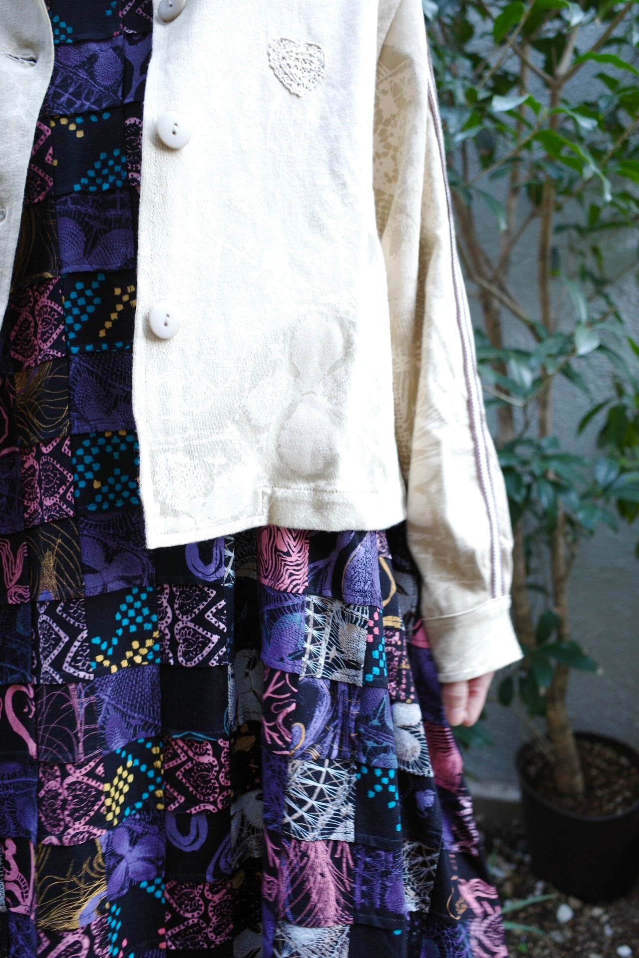 襟ぐりはつまっていて、裾はビルヘンワンピースのように真ん中が長いデザイン。