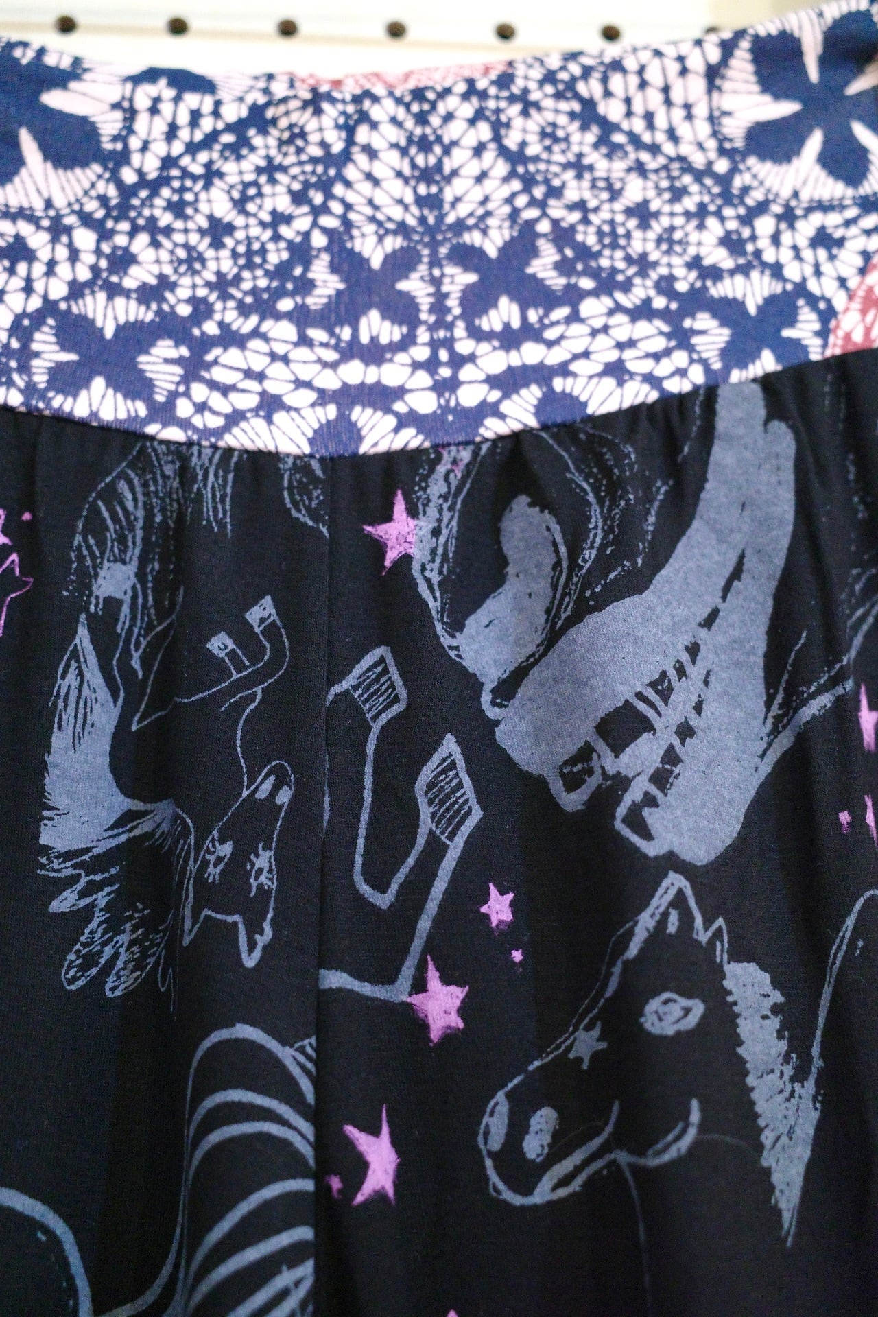 ウエストはゴムが入っておらず伸びてお腹に沿うデザインです。