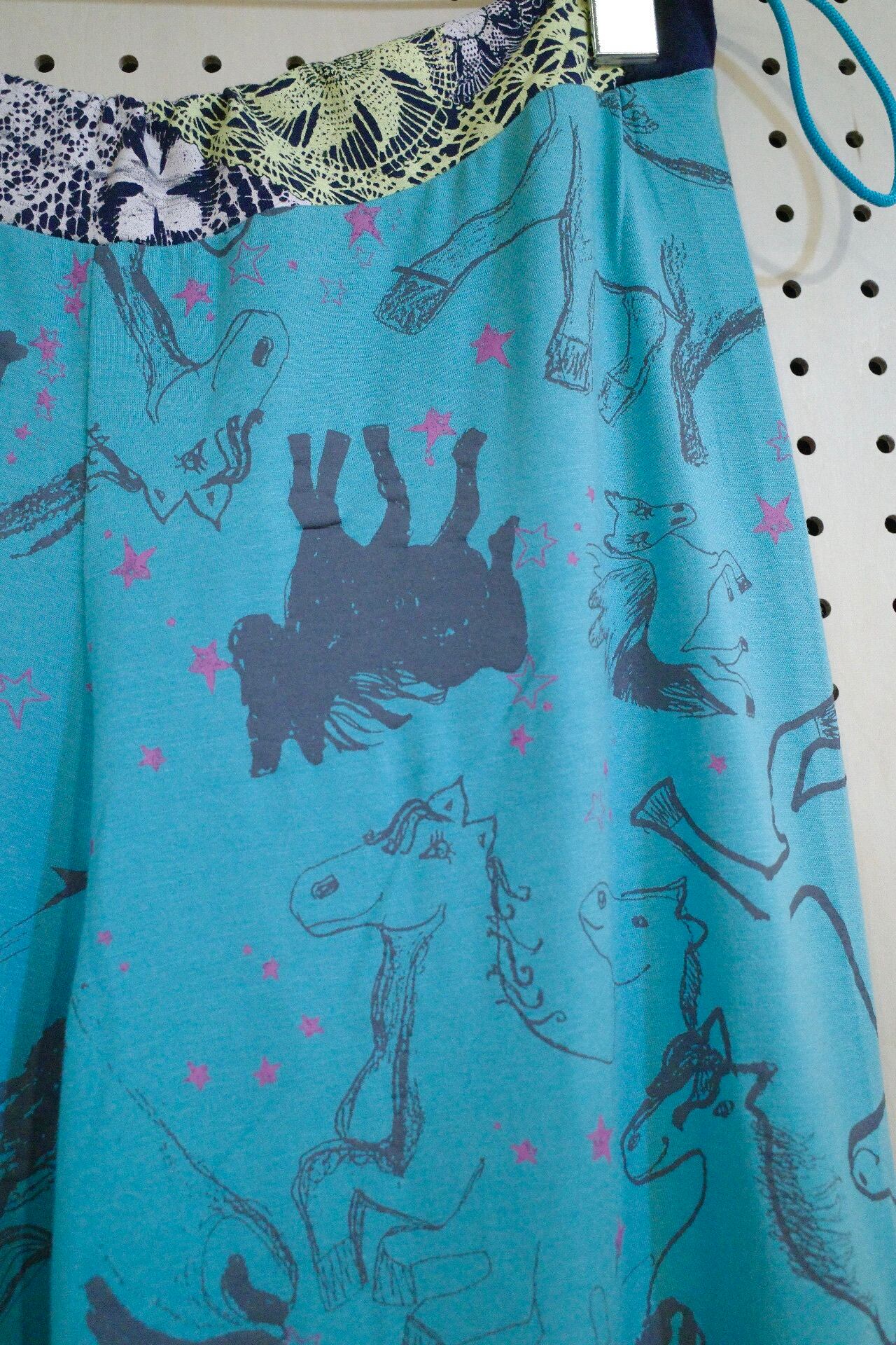ウエストの生地の切り替えもポイントです。ウエスト部にカラフルなゴムが入っており、左腰できゅっとゴムを絞ってウエストの調節ができます。