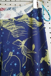 ウエストの生地の切り替えもポイントです。ウエスト部にカラフルなゴムが入っており、左腰できゅっとゴムを絞ってウエストの調節ができます。