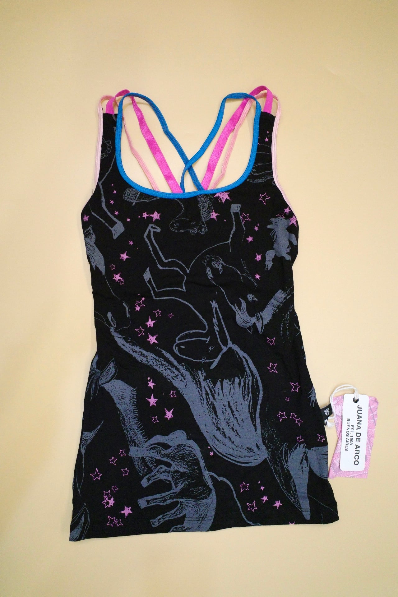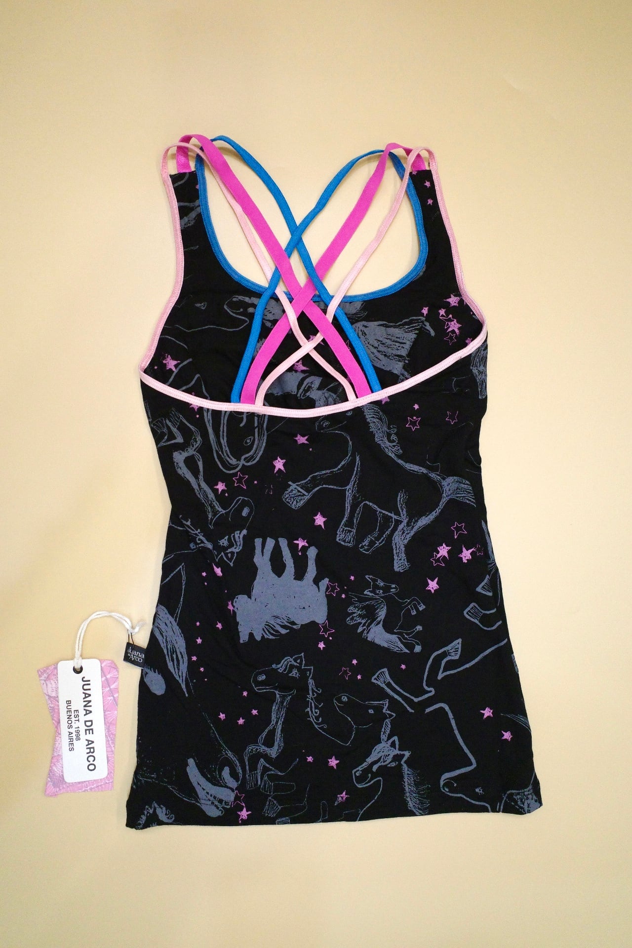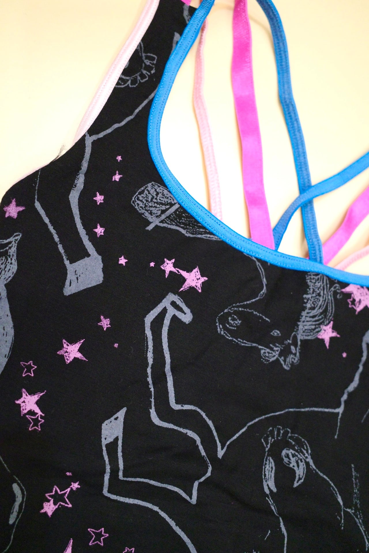 胸元はパッドポケット付きで一枚でインナーに。カラフルな3本ストラップが背中で交差するデザイン。