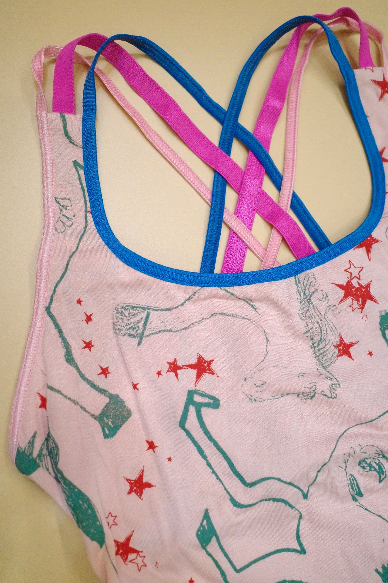 胸元はパッドポケット付きで一枚でインナーに。カラフルな3本ストラップが背中で交差するデザイン。