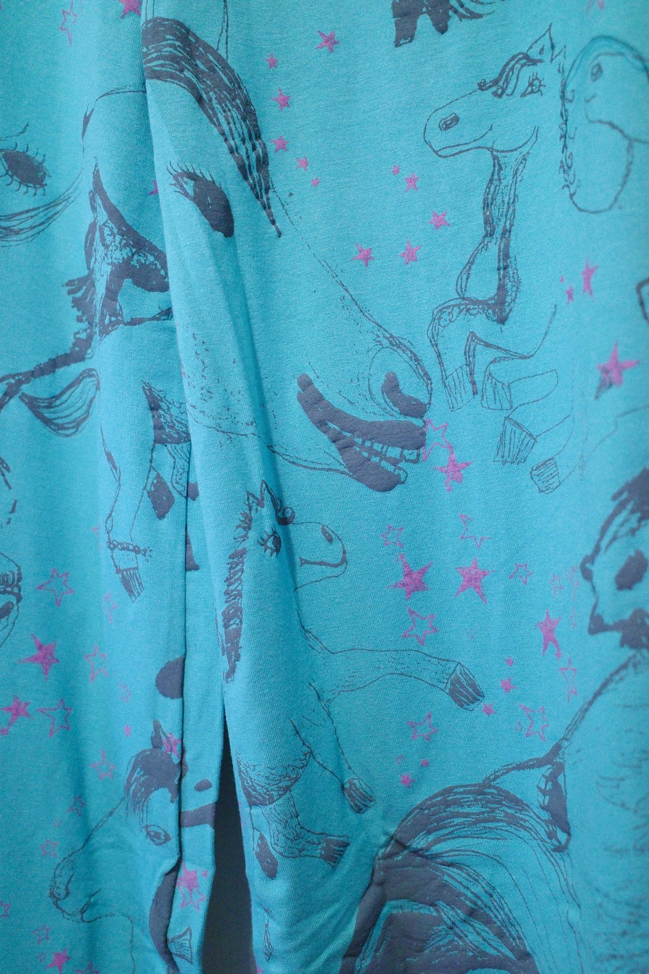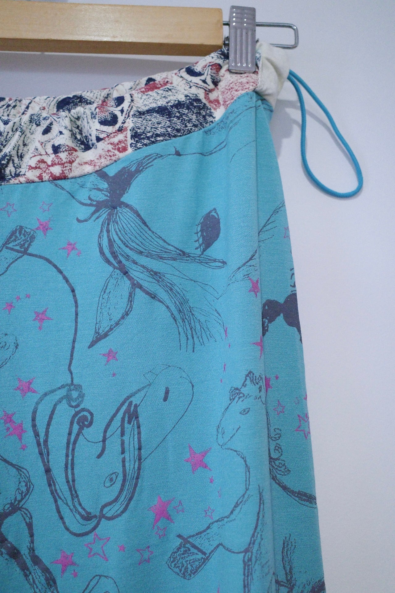 ウエストの生地の切り替えもポイントです。ウエスト部にカラフルなゴムが入っており、左腰できゅっとゴムを絞ってウエストの調節ができます。