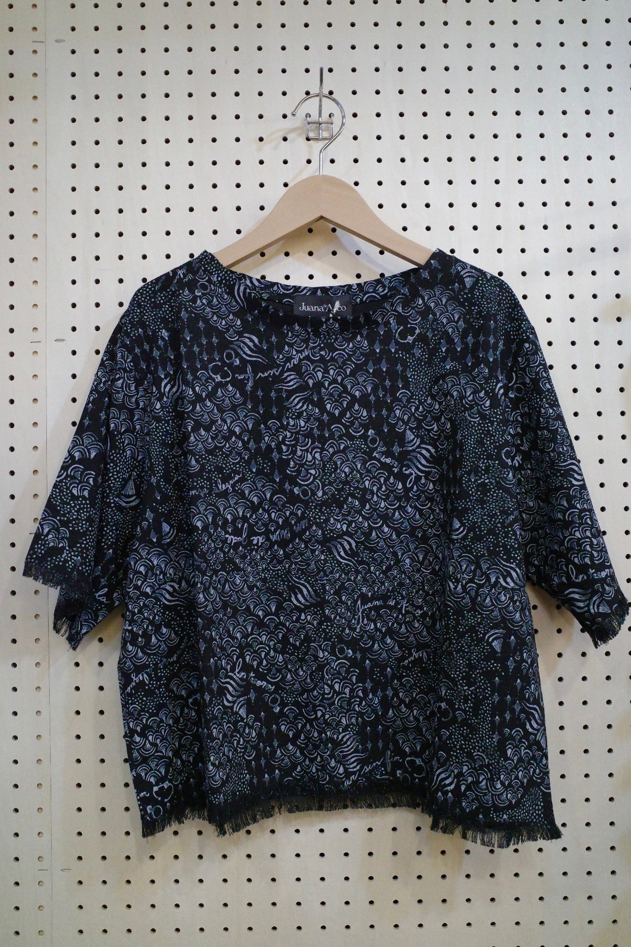 袖口と裾にはさりげないフリンジをあしらい、シンプルな中にもJuana de Arcoらしい遊び心をプラス。