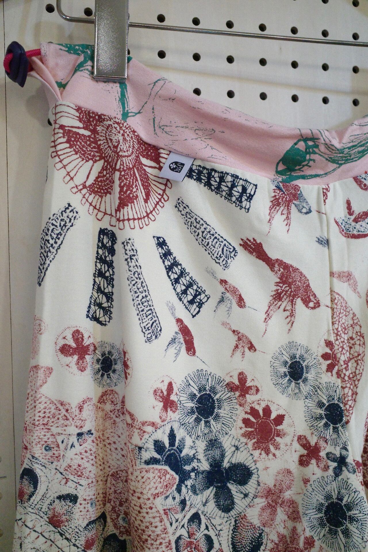 ウエストの生地の切り替えもポイントです。ウエスト部にカラフルなゴムが入っており、左腰できゅっとゴムを絞ってウエストの調節ができます。