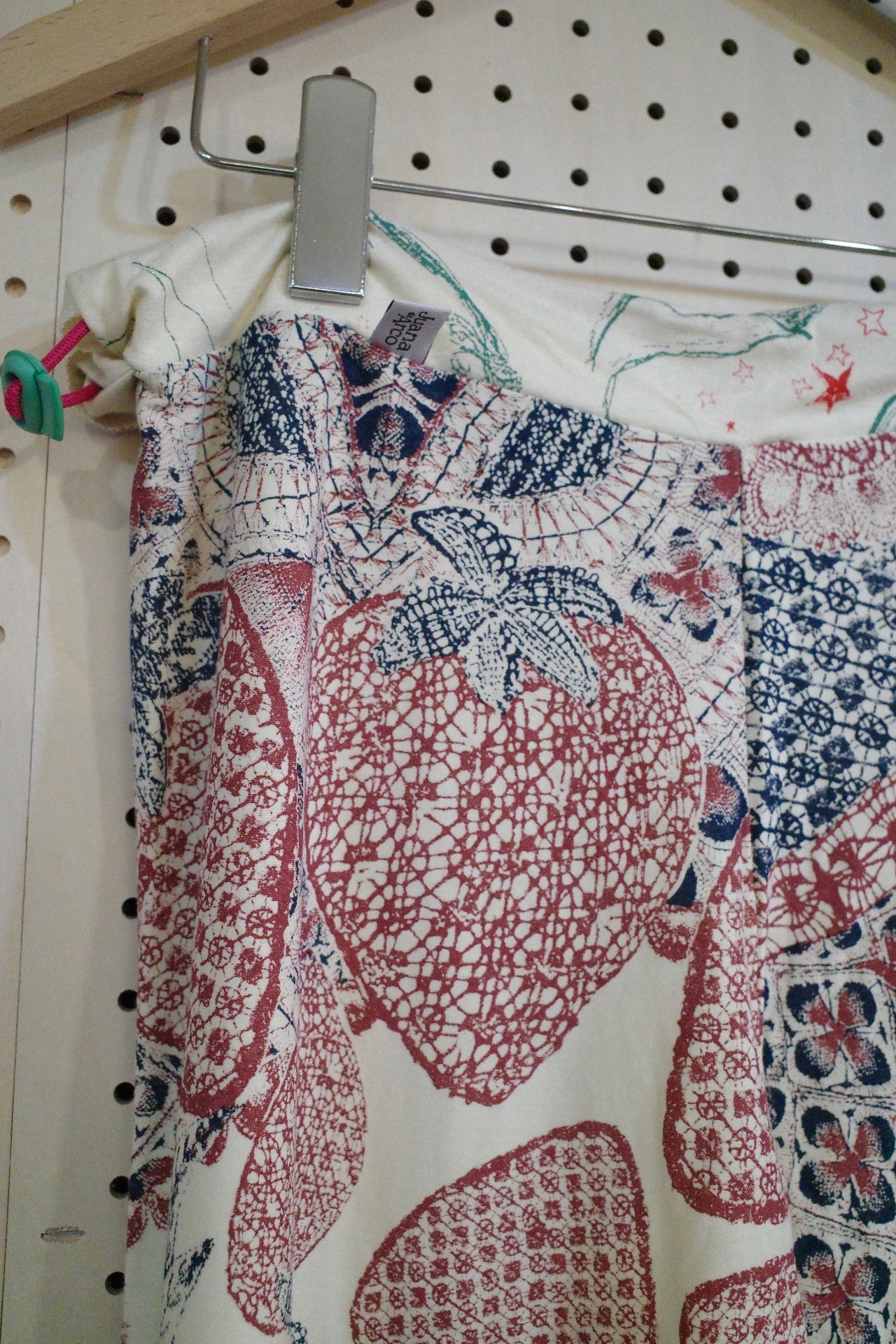 ウエストの生地の切り替えもポイントです。ウエスト部にカラフルなゴムが入っており、左腰できゅっとゴムを絞ってウエストの調節ができます。