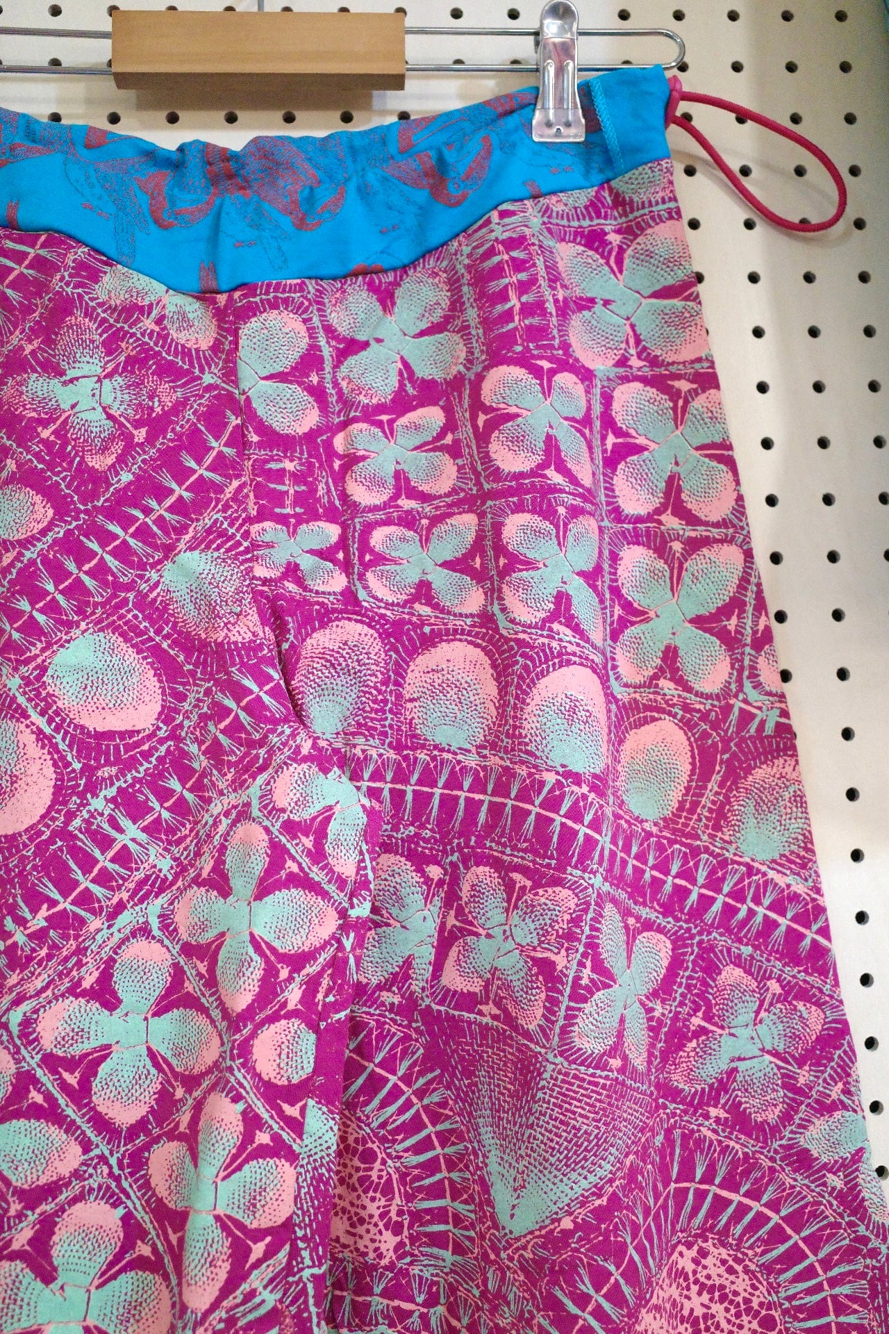 ウエストの生地の切り替えもポイントです。ウエスト部にカラフルなゴムが入っており、左腰できゅっとゴムを絞ってウエストの調節ができます。