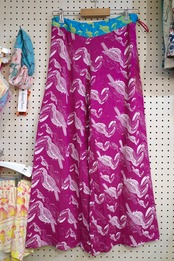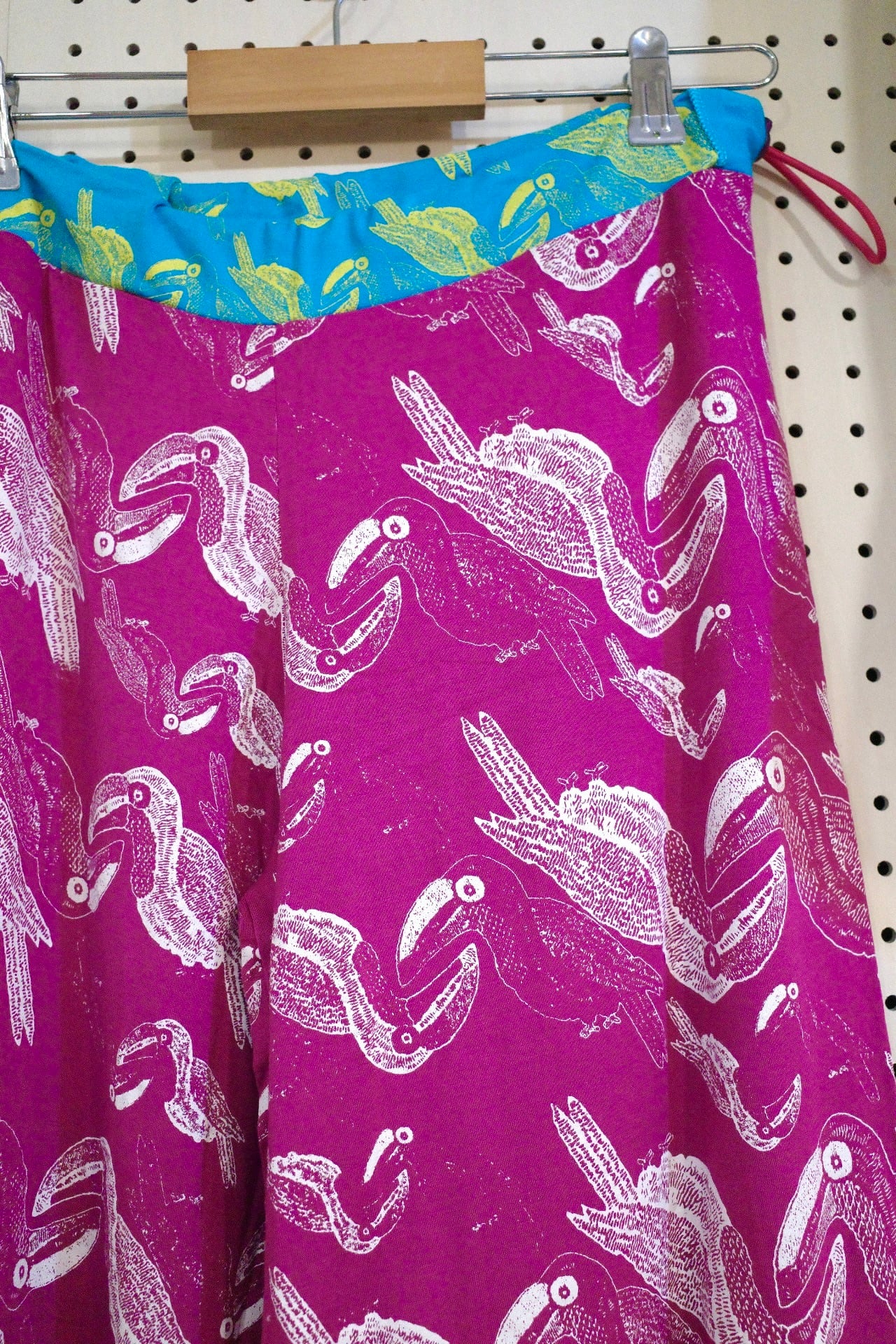 ウエストの生地の切り替えもポイントです。ウエスト部にカラフルなゴムが入っており、左腰できゅっとゴムを絞ってウエストの調節ができます。