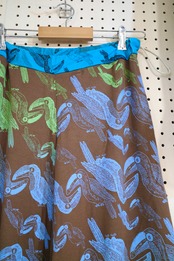 ウエストの生地の切り替えもポイントです。ウエスト部にカラフルなゴムが入っており、左腰できゅっとゴムを絞ってウエストの調節ができます。