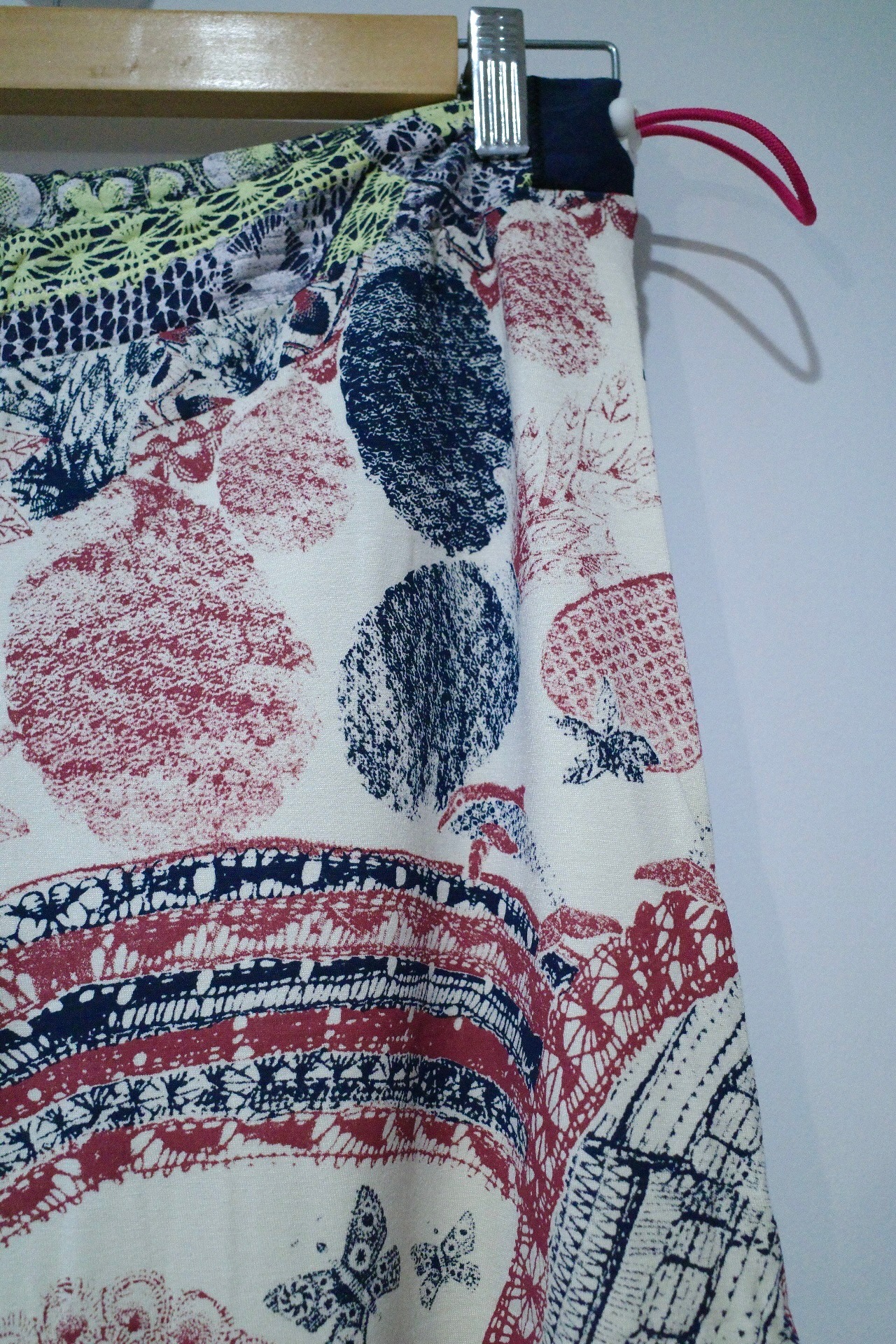 ウエストの生地の切り替えもポイントです。ウエスト部にカラフルなゴムが入っており、左腰できゅっとゴムを絞ってウエストの調節ができます。