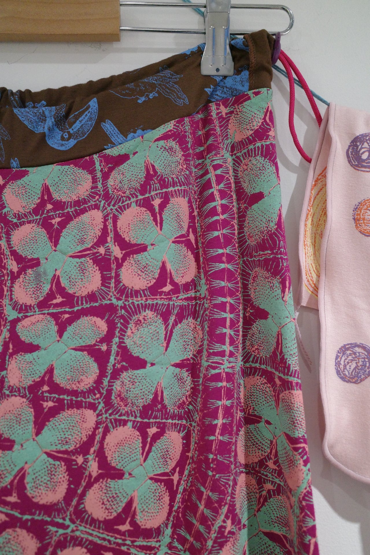ウエストの生地の切り替えもポイントです。ウエスト部にカラフルなゴムが入っており、左腰できゅっとゴムを絞ってウエストの調節ができます。