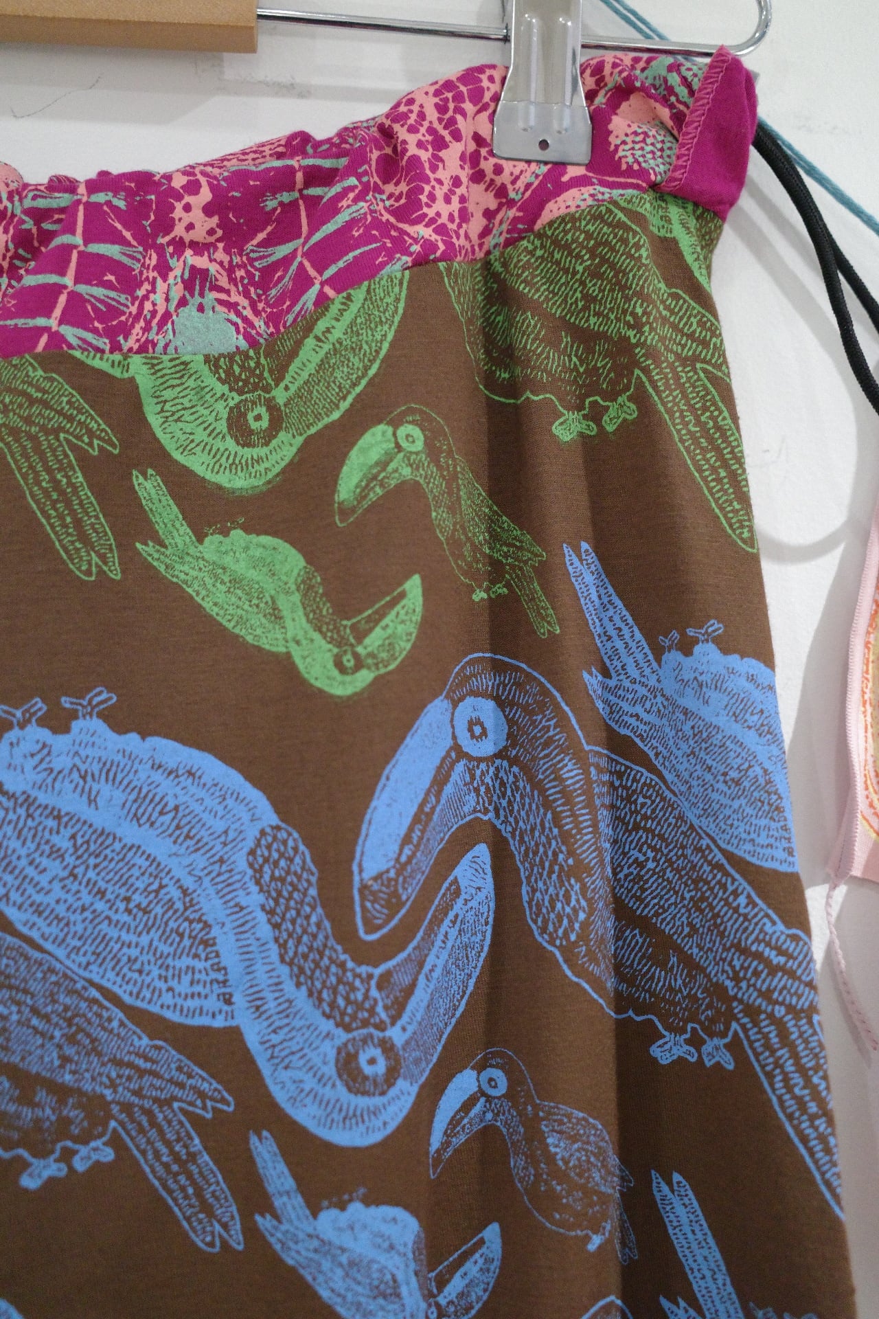 ウエストの生地の切り替えもポイントです。ウエスト部にカラフルなゴムが入っており、左腰できゅっとゴムを絞ってウエストの調節ができます。