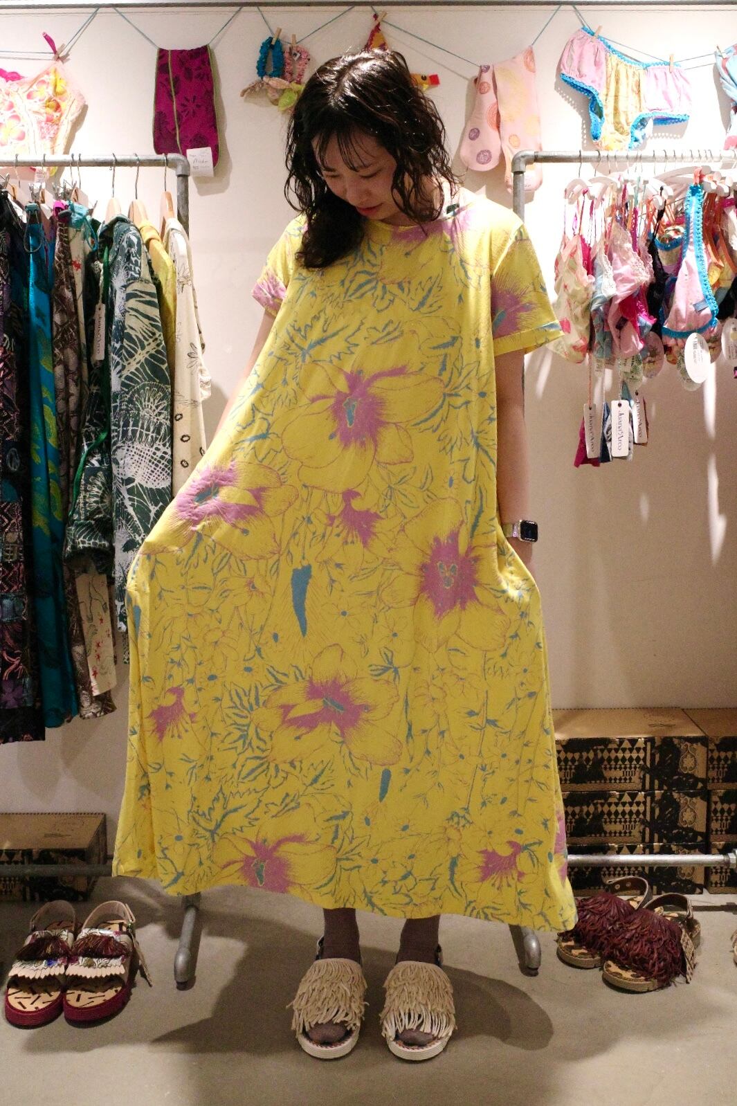 陽の光をそのまま纏ったような、ピンクやイエローのベースカラーにフラワープリントが印象的なFELIZ PRIMAVERAシリーズよりマキシワンピース。