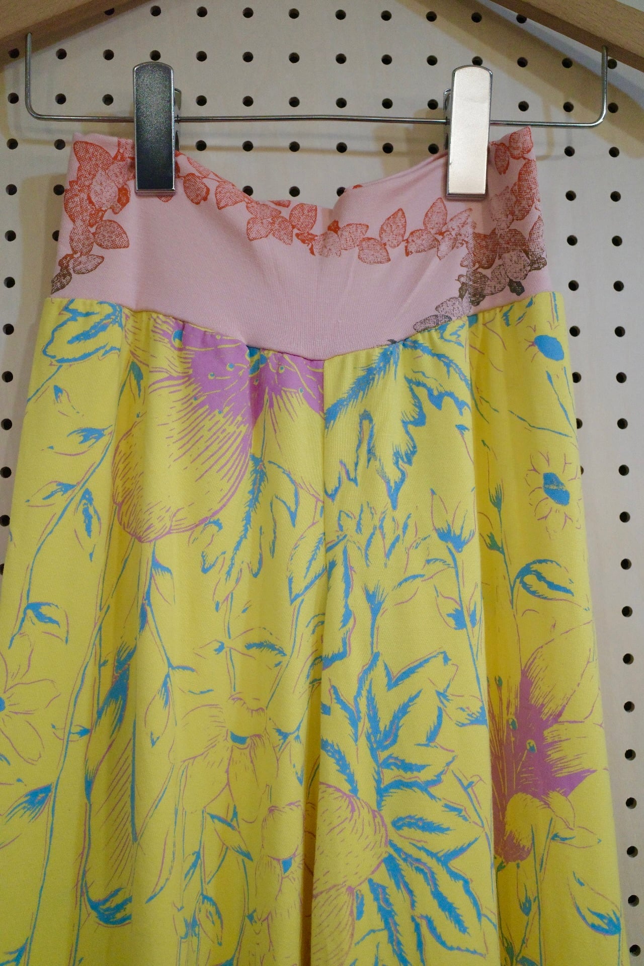 ウエストはゴムが入っておらず伸びてお腹に沿うデザインです。