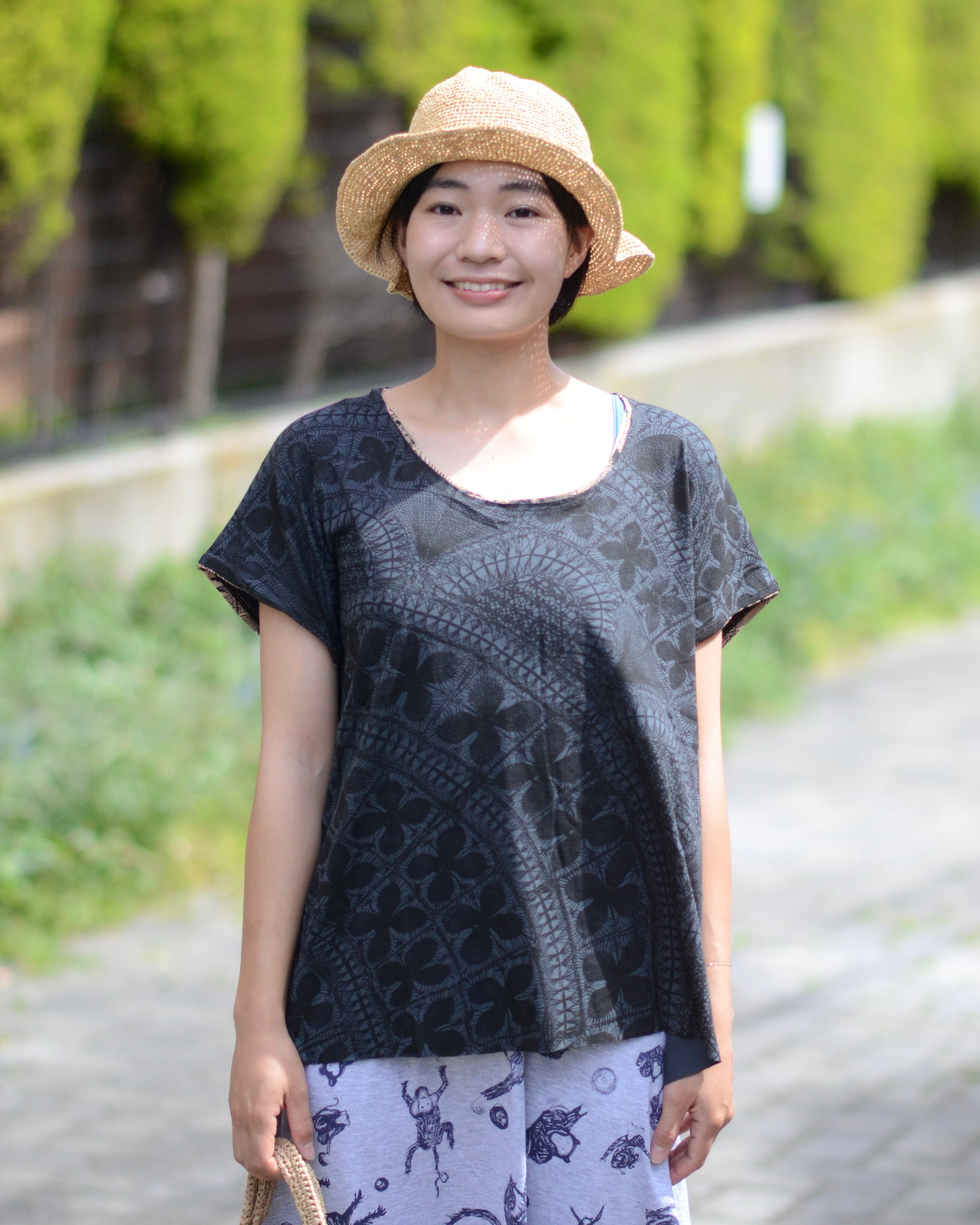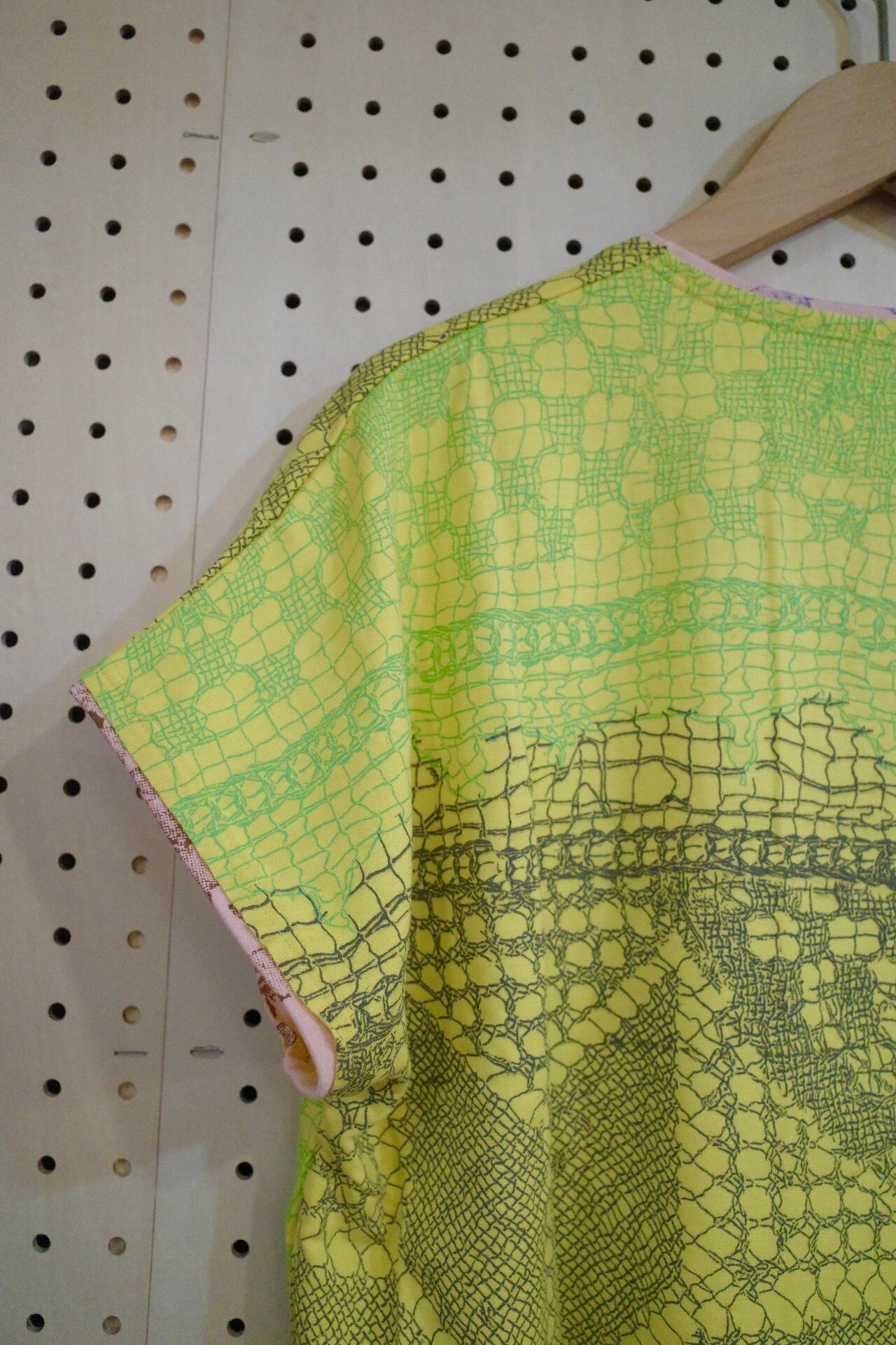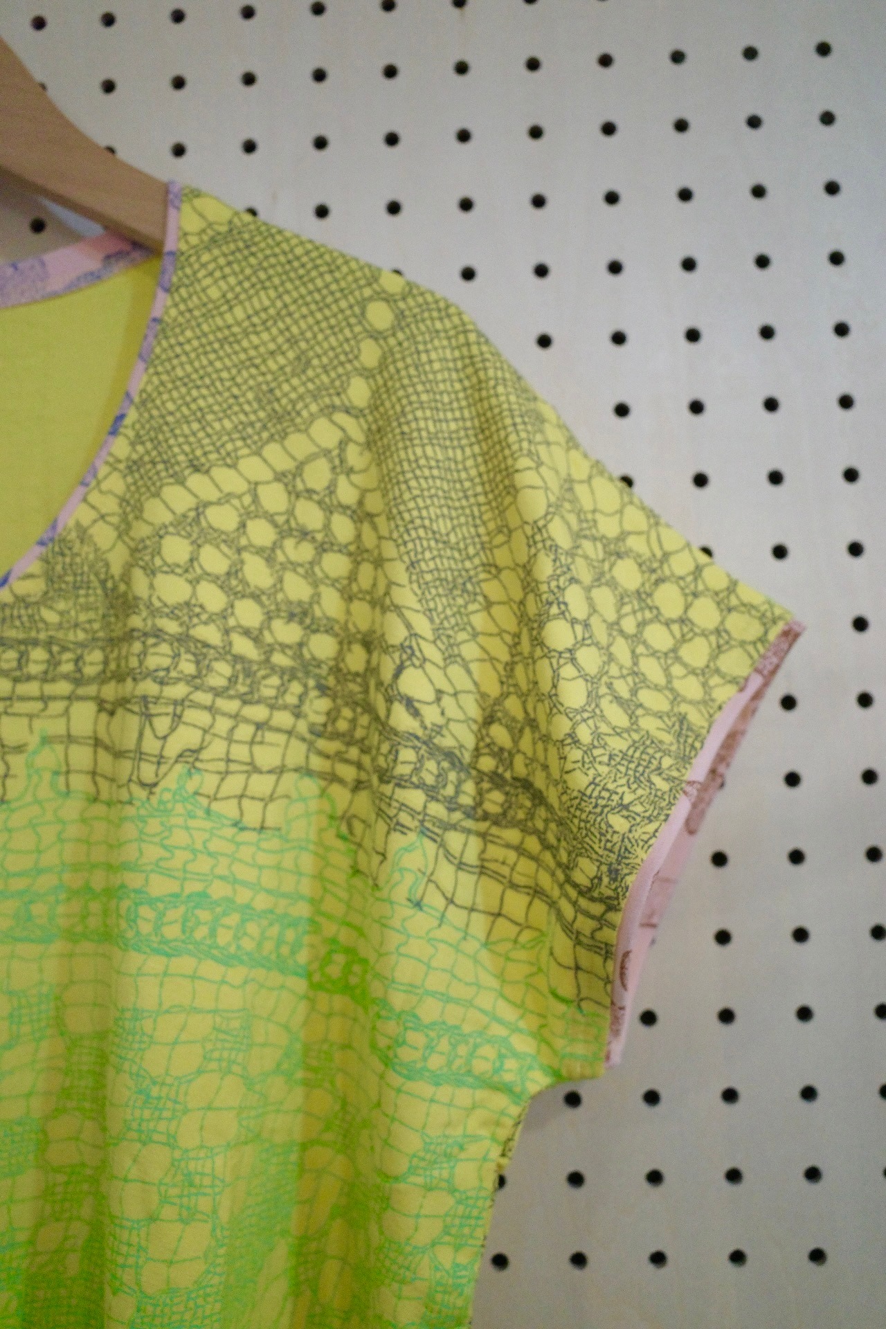 襟ぐりと袖ぐりに別布のパイピングが入っているのがポイントです。