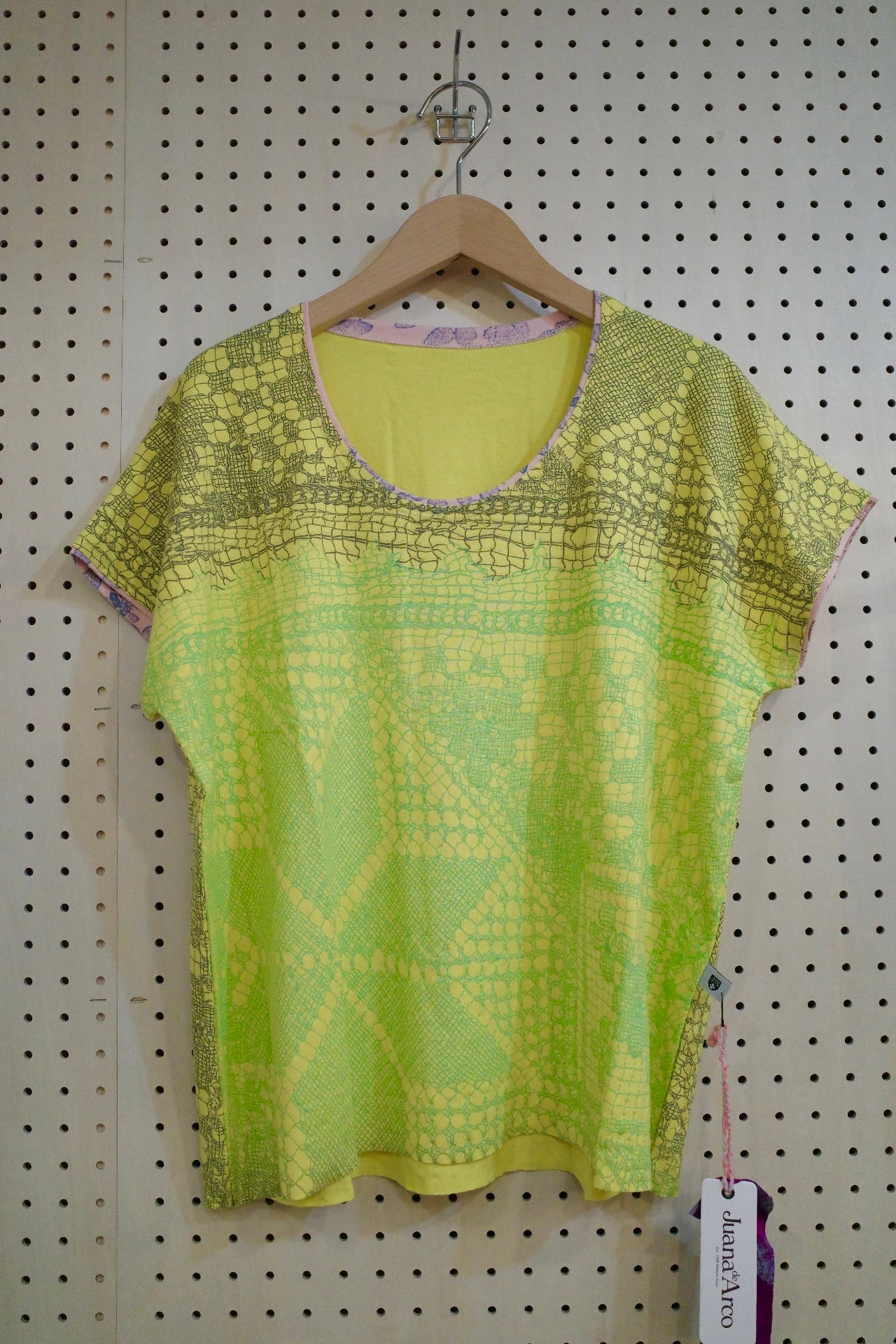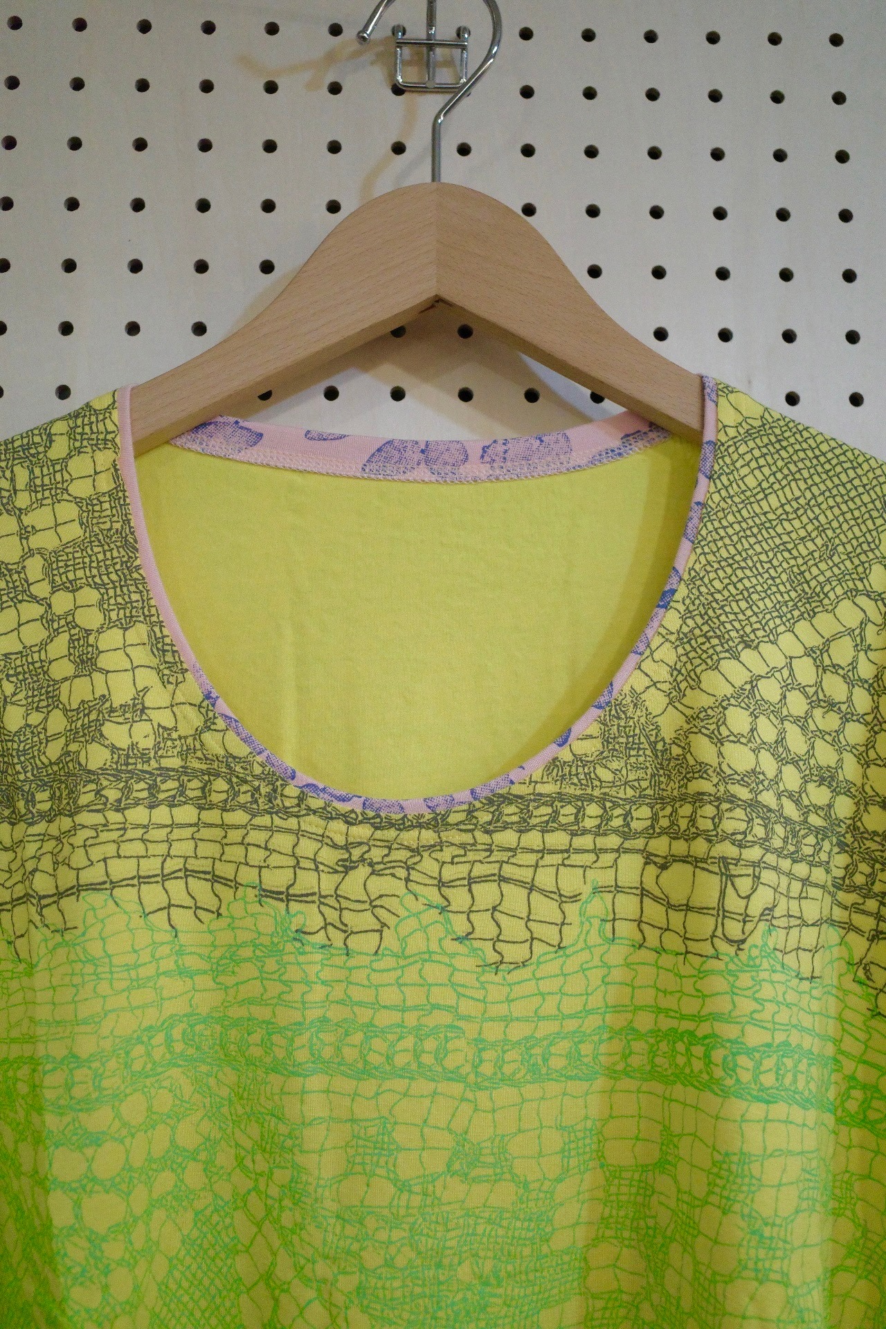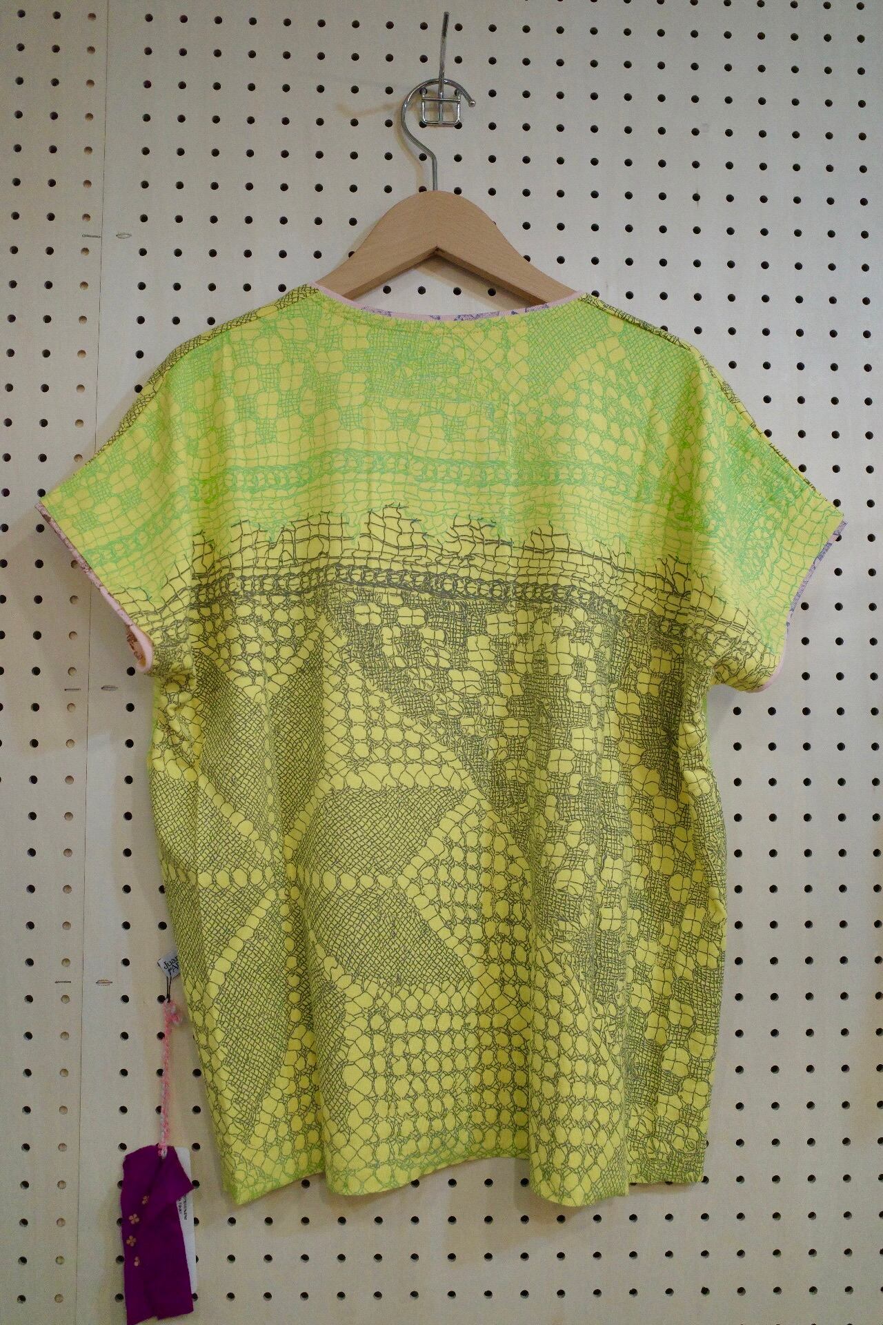 襟ぐりと袖ぐりに別布のパイピングが入っているのがポイントです。
