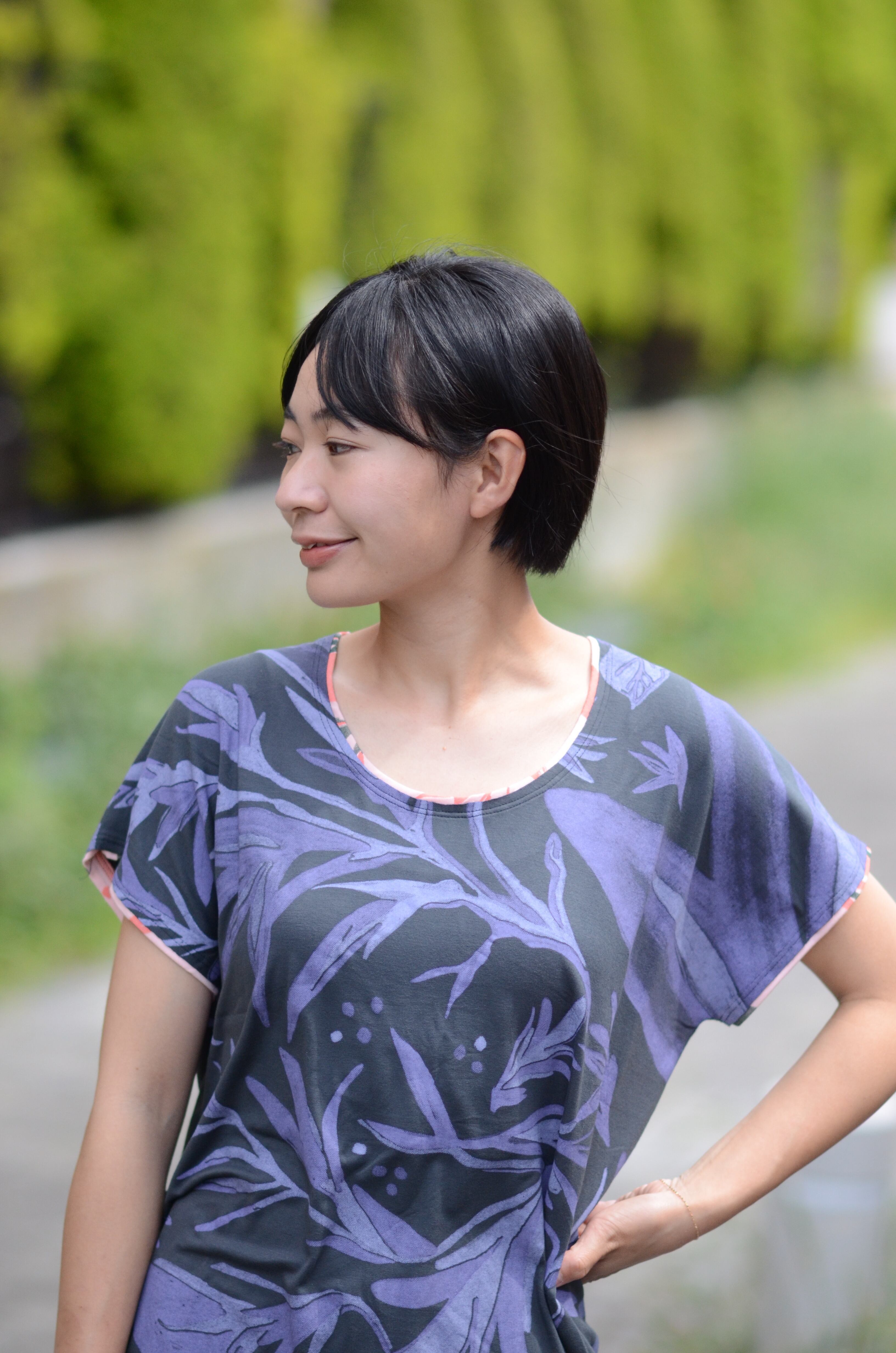 襟ぐりと袖ぐりに別布のパイピングが入っているのがポイントです。