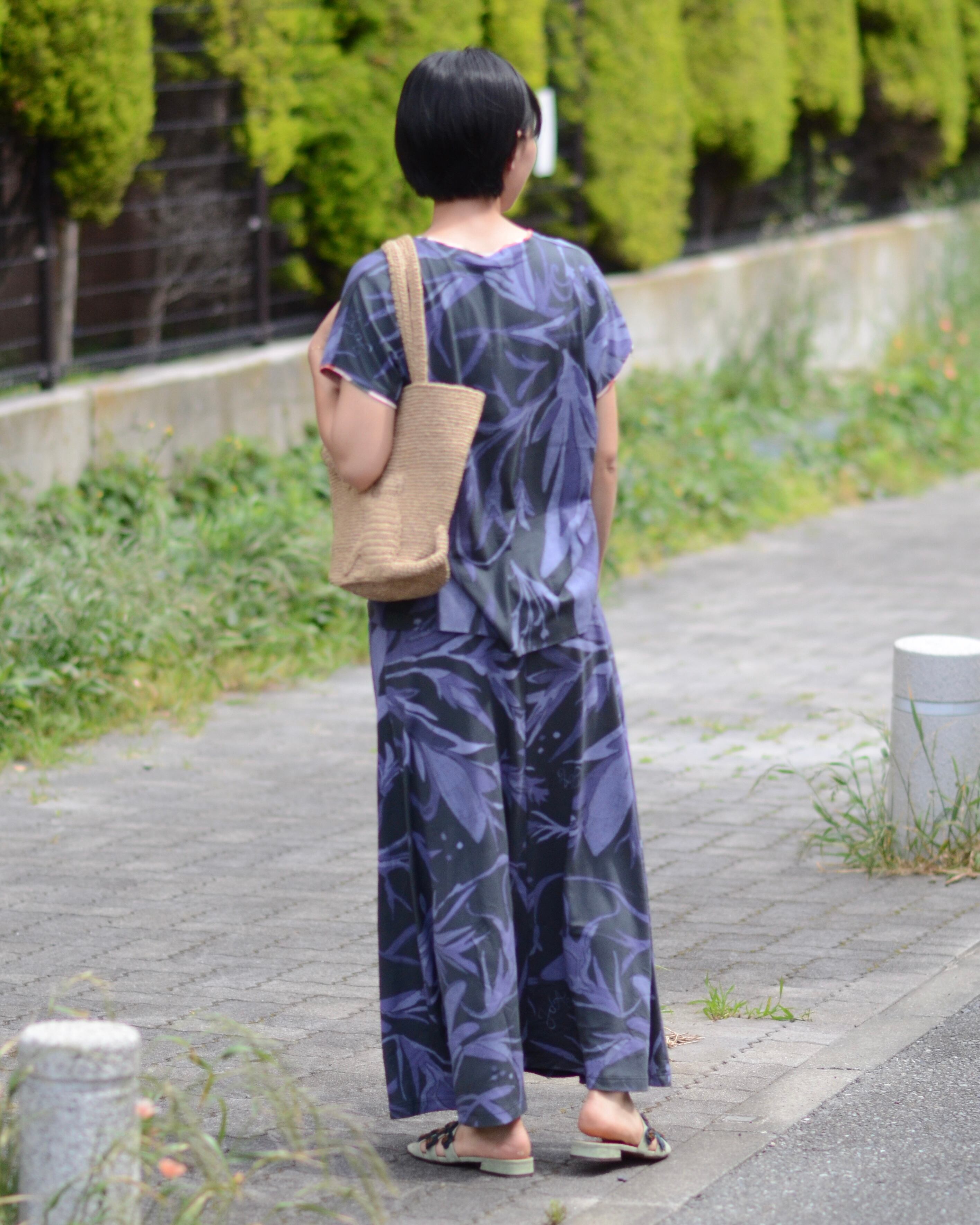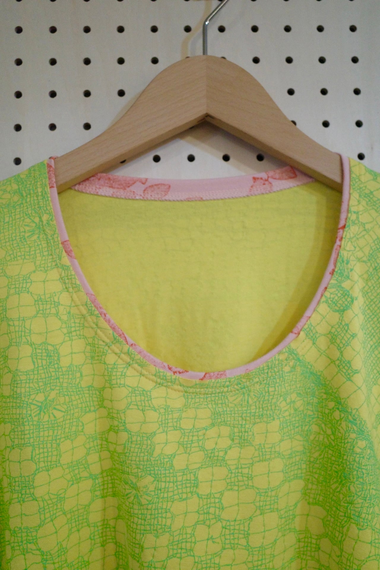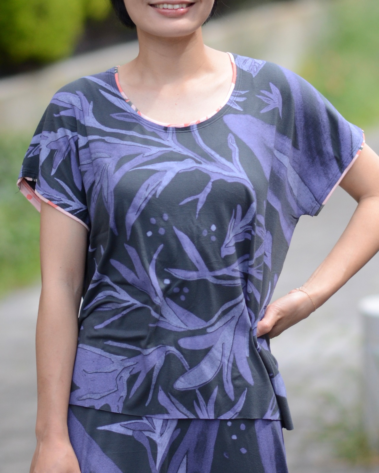 襟ぐりと袖ぐりに別布のパイピングが入っているのがポイントです。