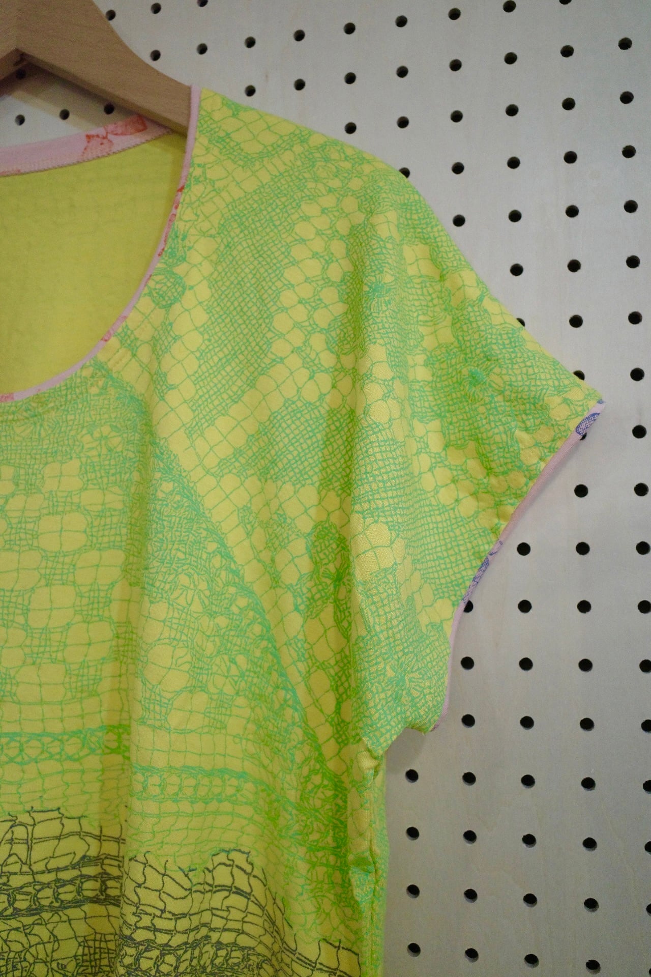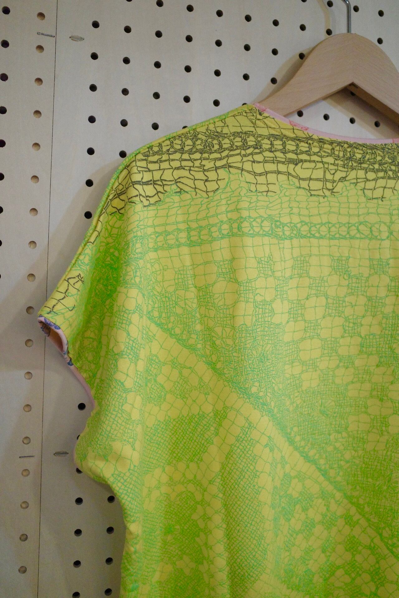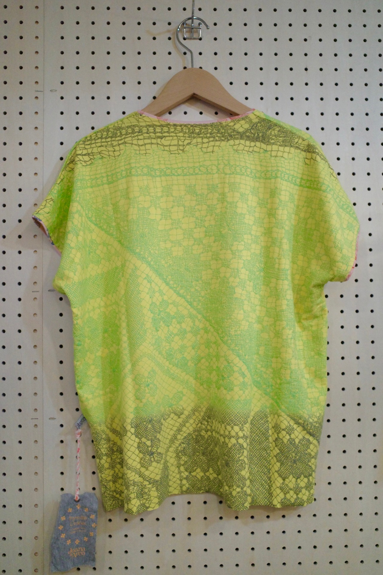 襟ぐりと袖ぐりに別布のパイピングが入っているのがポイントです。