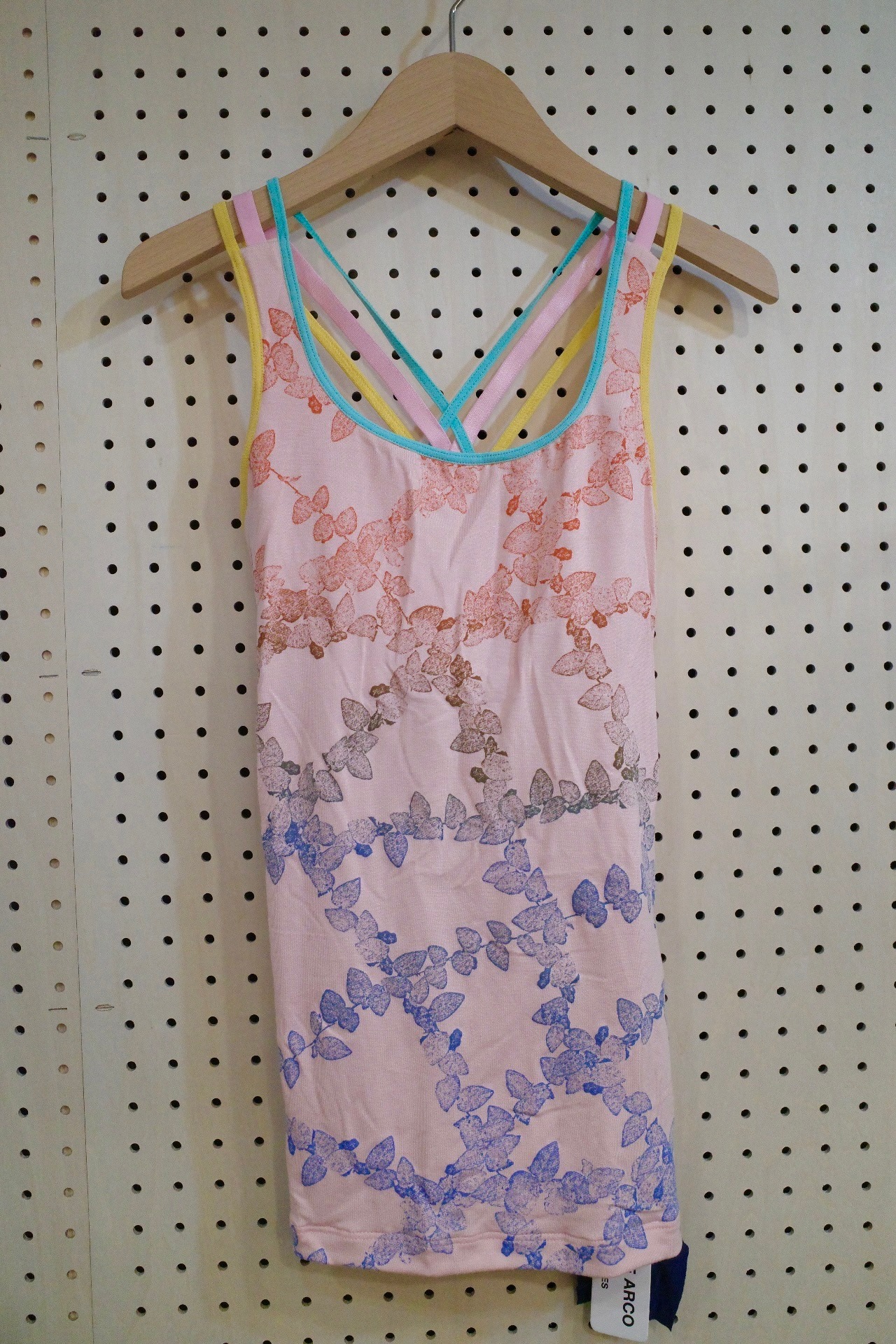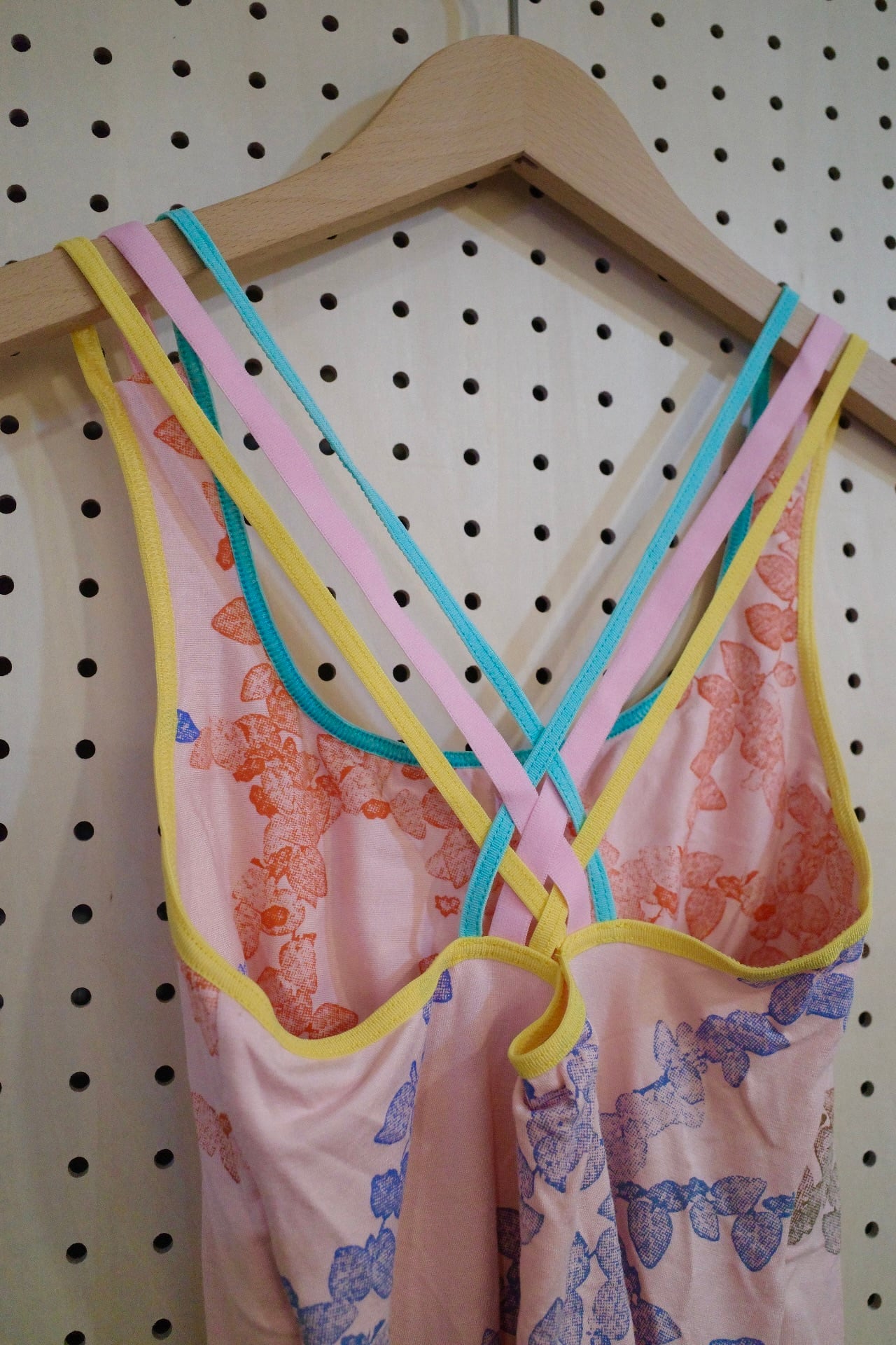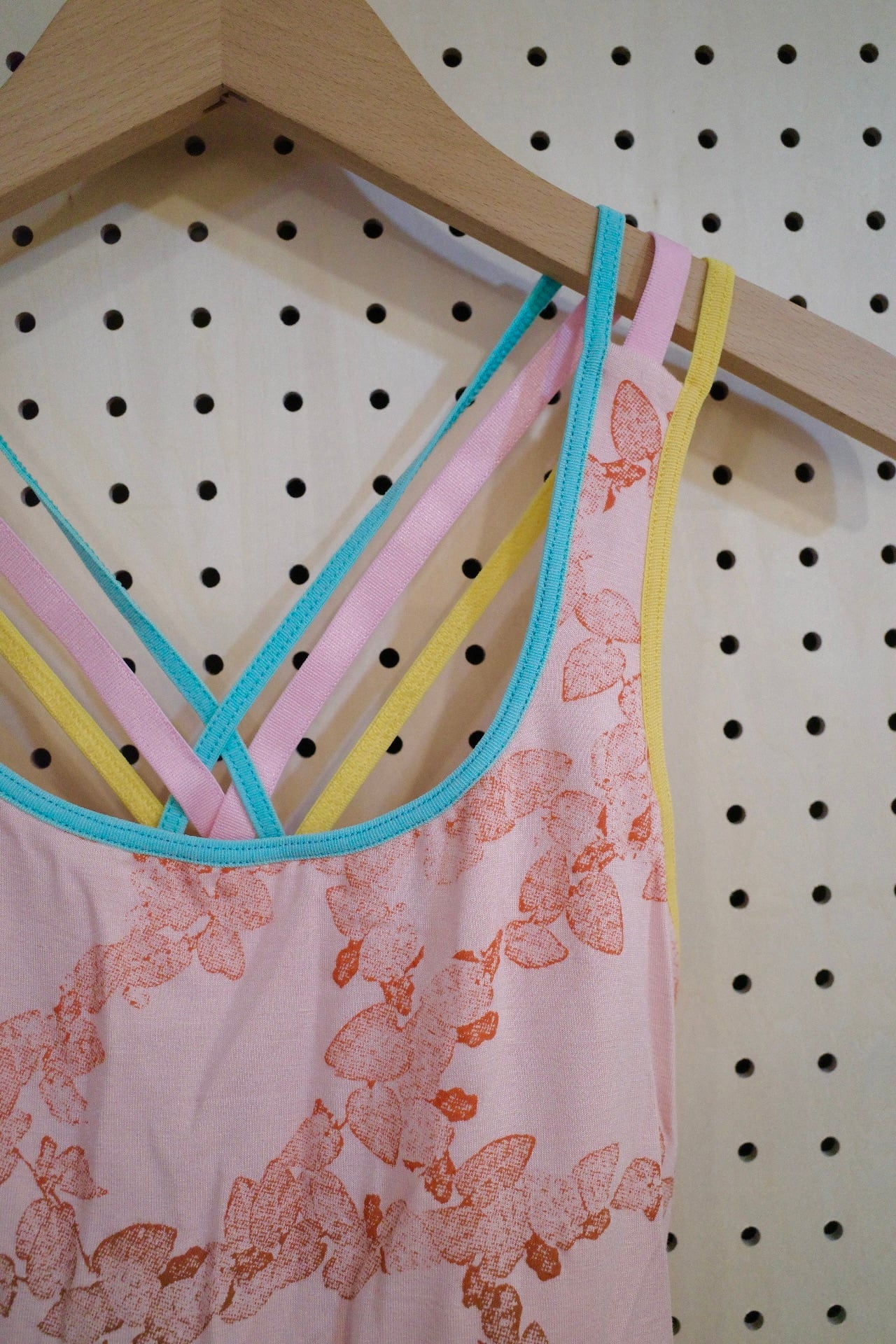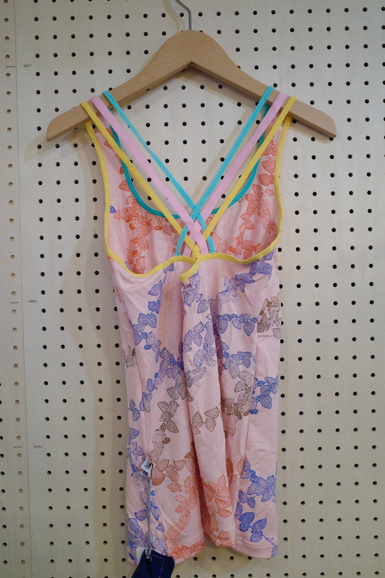 胸元はパッドポケット付きで一枚でインナーに。カラフルな3本ストラップが背中で交差するデザイン。