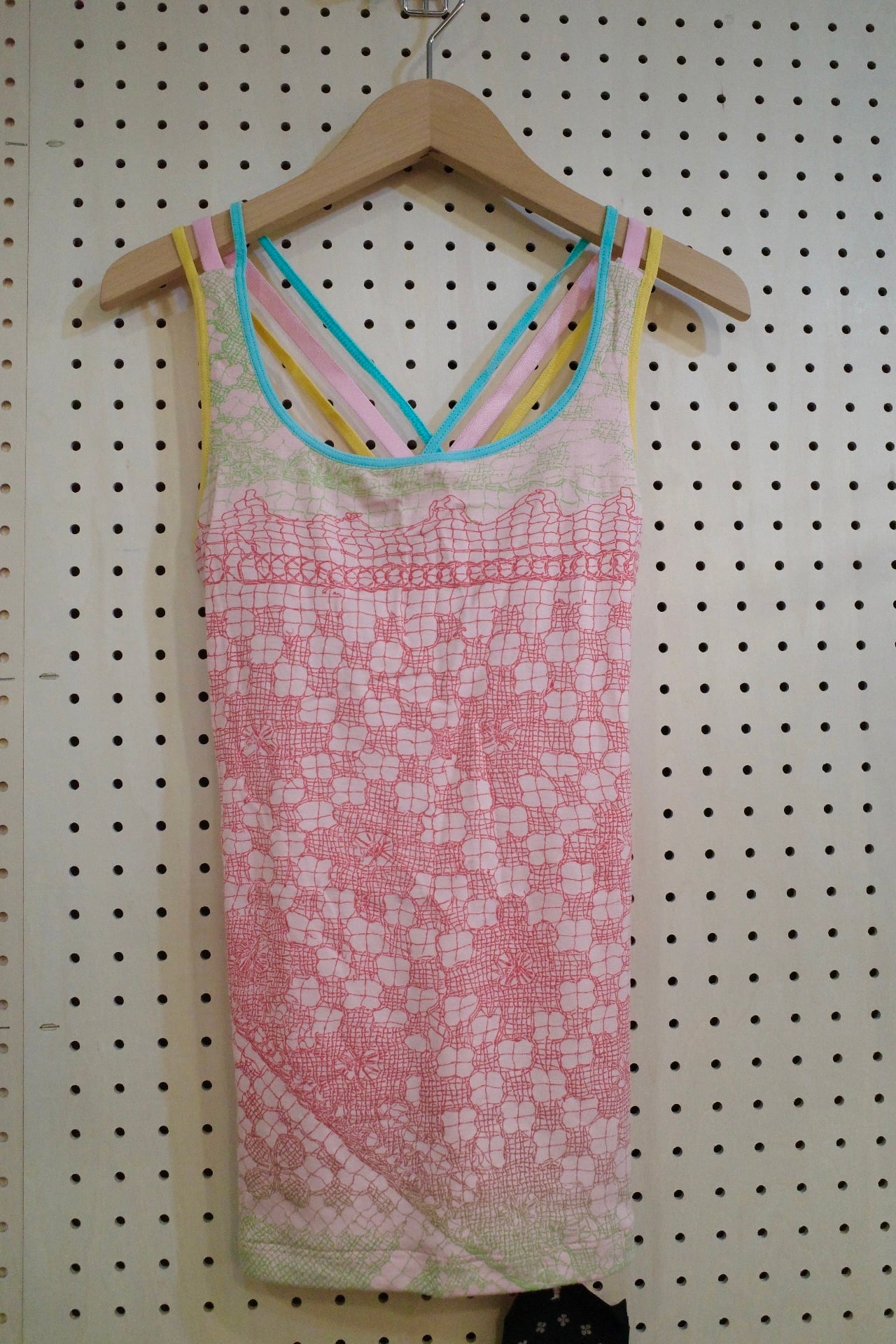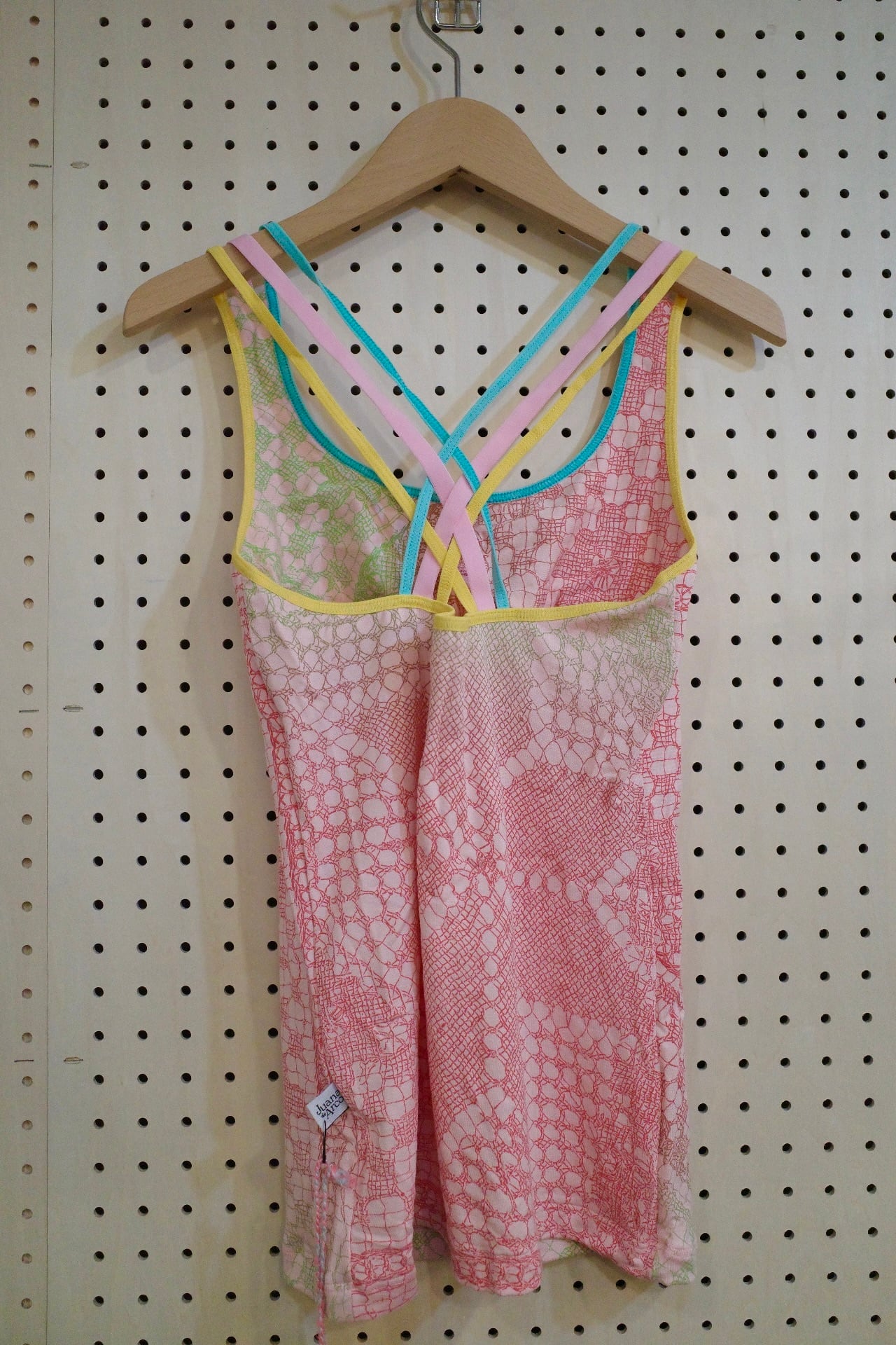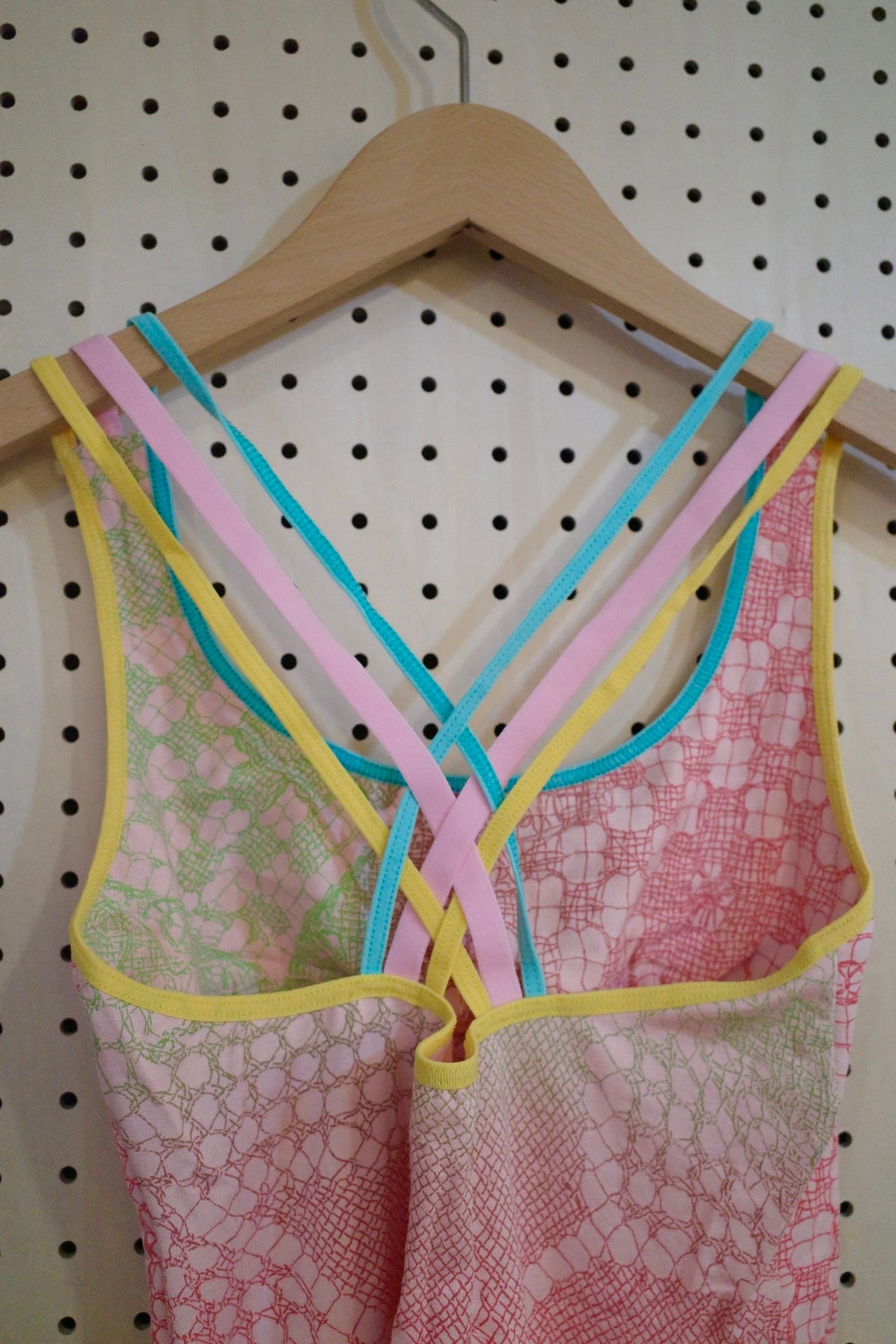 胸元はパッドポケット付きで一枚でインナーに。カラフルな3本ストラップが背中で交差するデザイン。