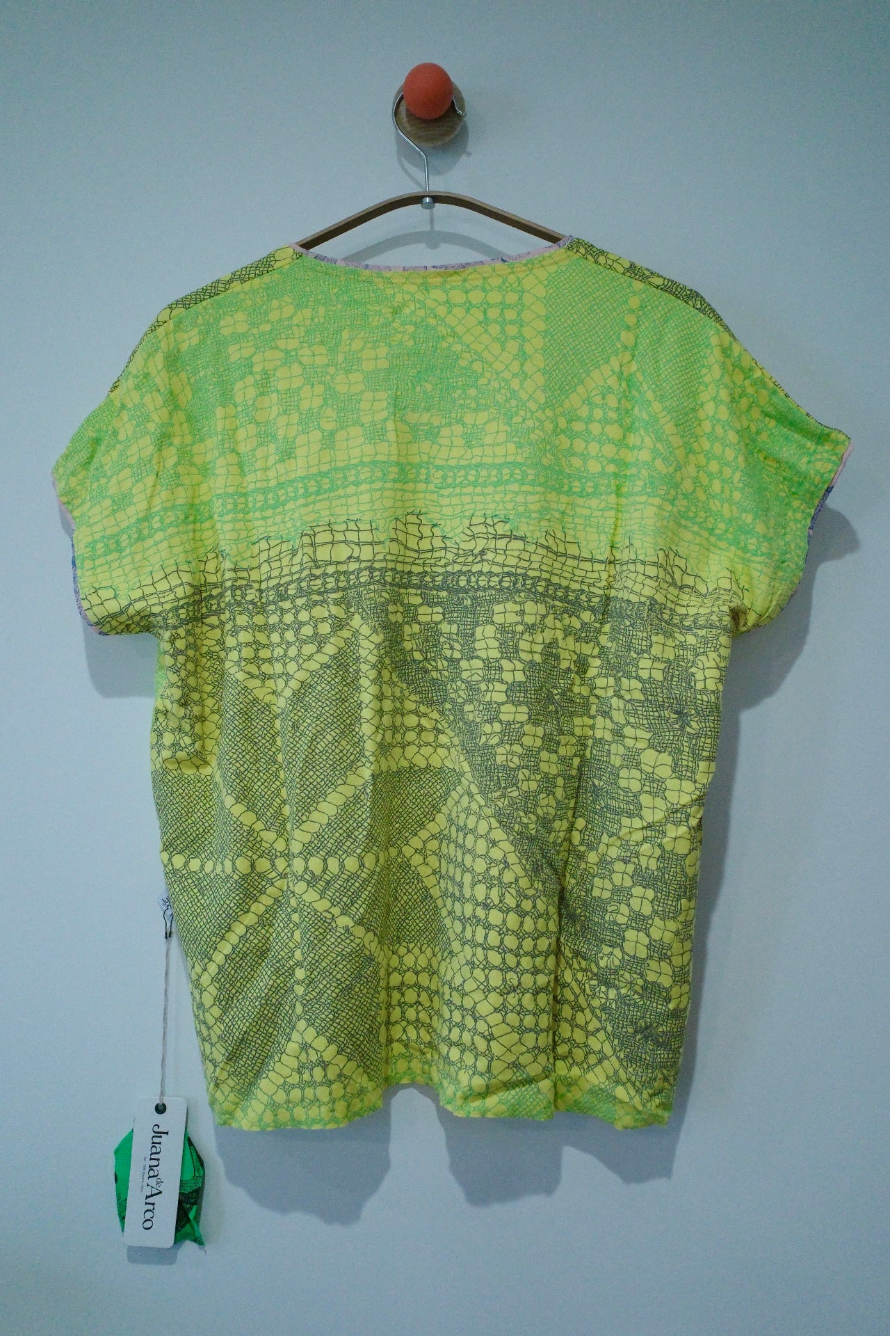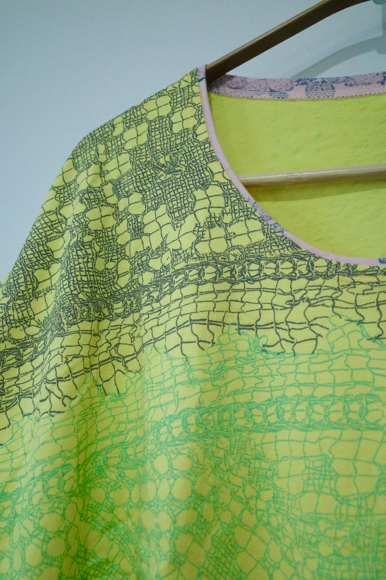 襟ぐりと袖ぐりに別布のパイピングが入っているのがポイントです。