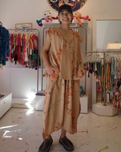 フレアたっぷりのワイドパンツで、裾に切り込みがあり結んでシルエットも変えていただけます。パイピングや三つ編みベルトのディテールもポイントです。両サイドにポケット付き。